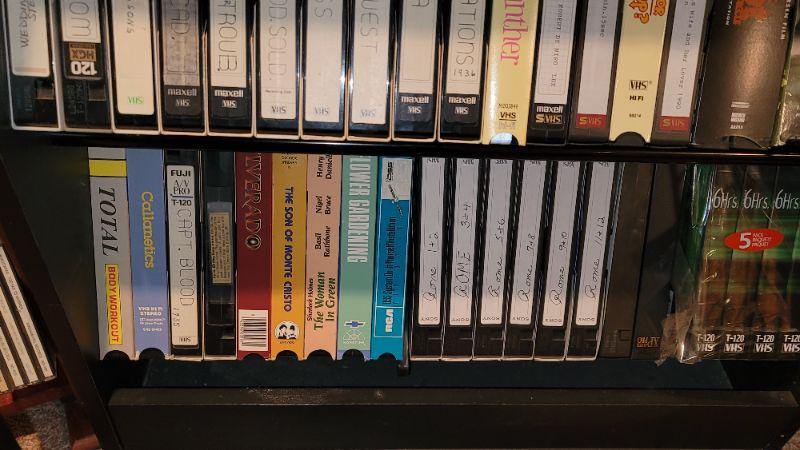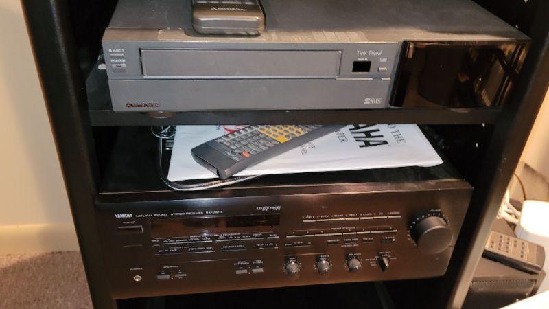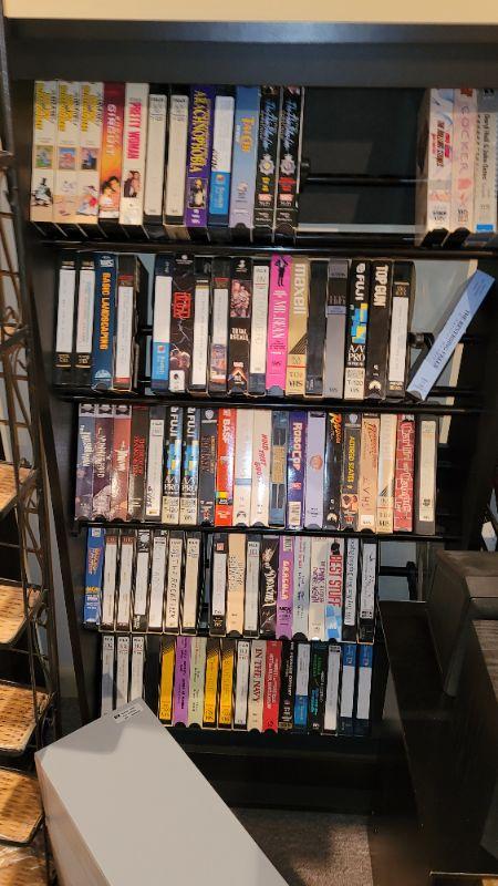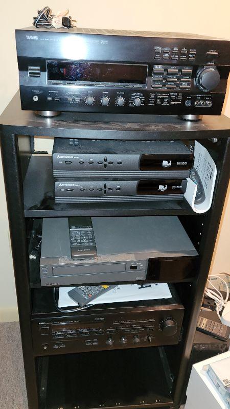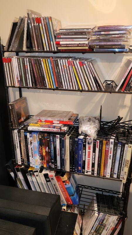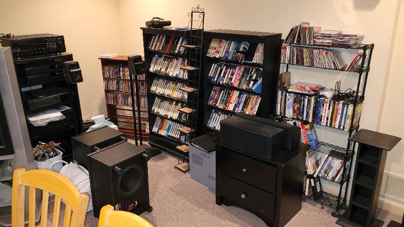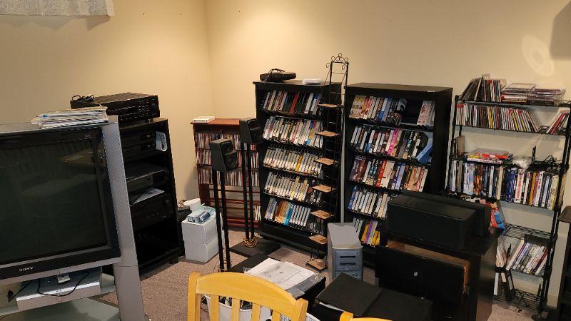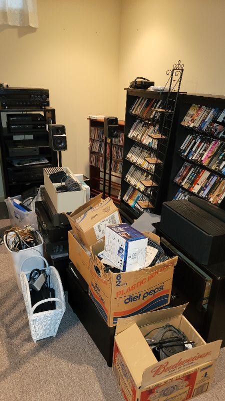 See pics, TV, tv stand, stereo, stereo cabinet,, bookcases,, media cases, speakers, music, vcr tapes and dvd movies, computer and much more
