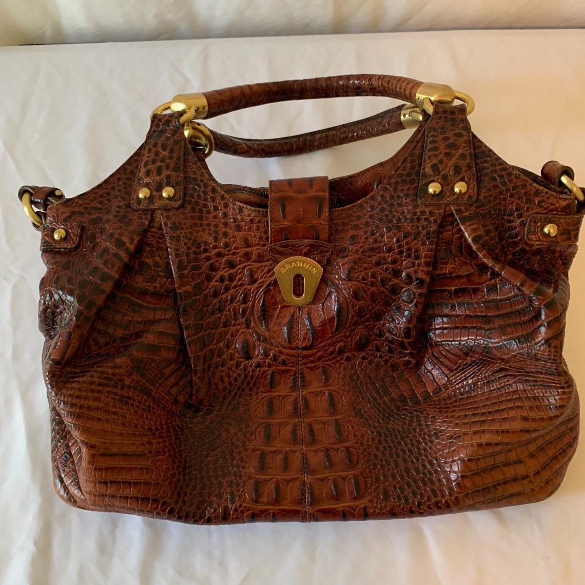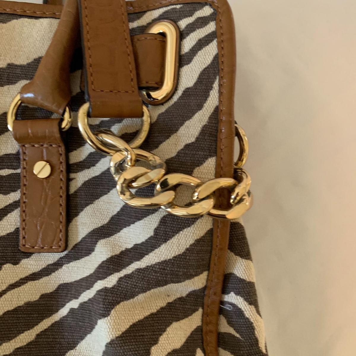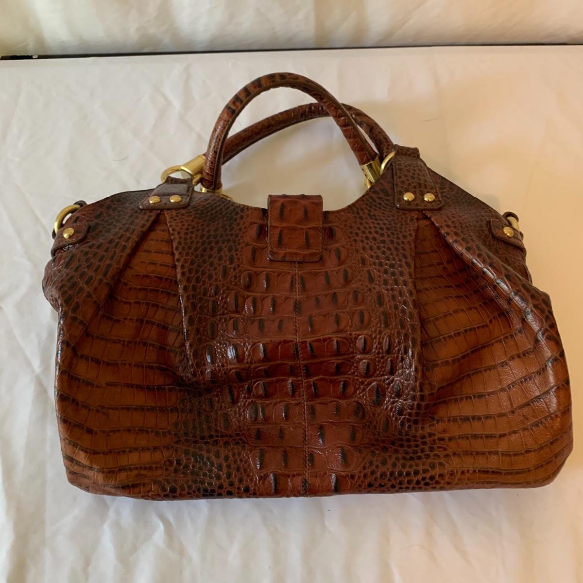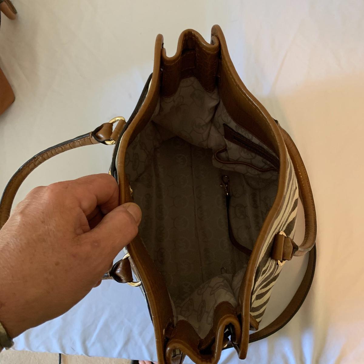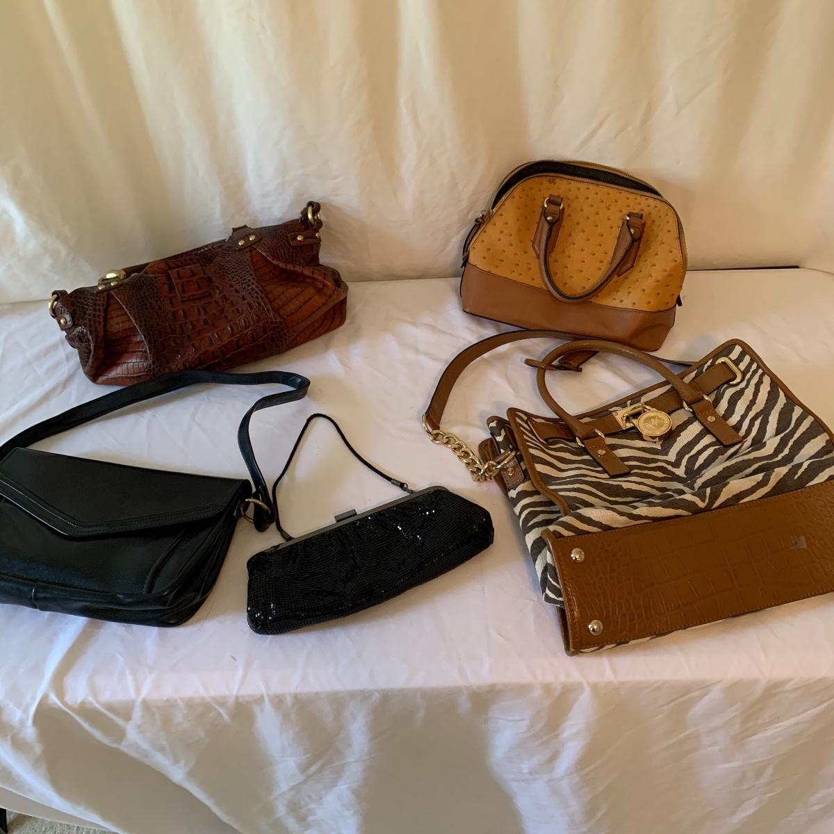 Ladies, it’s time to add to that purse collection! First up in this lot is a Brahmin faux alligator bag, it is missing its latch, but still lays flat and is in otherwise good condition. Approx 17" wide x 6' deep x 17' tall from handle. Next is a Michael Kohrs bag that features a zebra print canvas and gold hardware. This bag is in good condition. A black sequin clutch purse with corded handle is made by Lancôme in good condition. Also offered is a dark navy blue bag and brown satchel in good condition. Neither of the last two have markings of who they are made by. See pics for details. Shipping available.