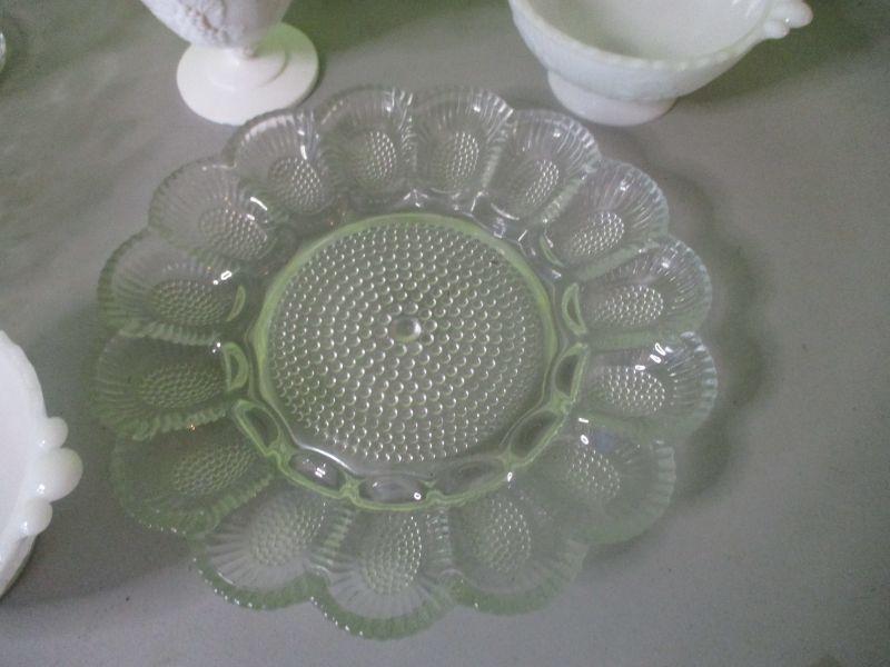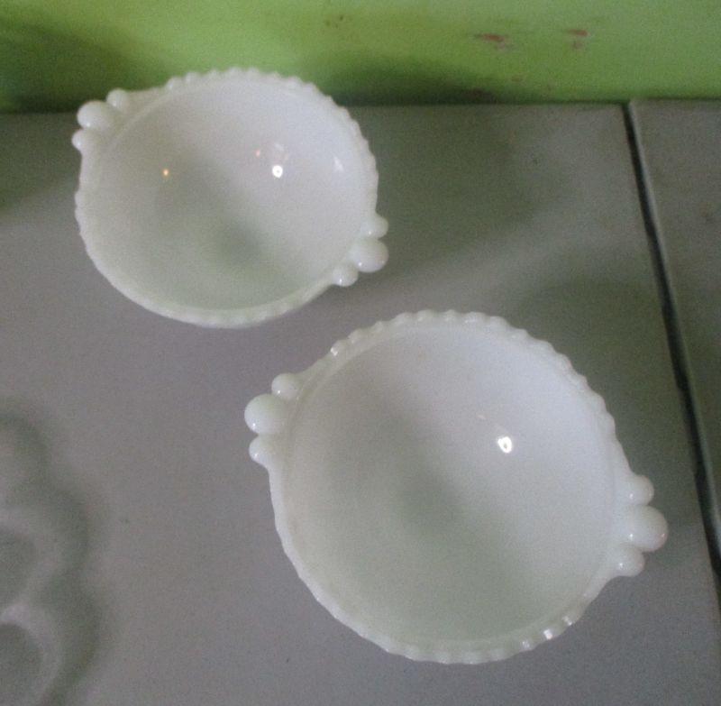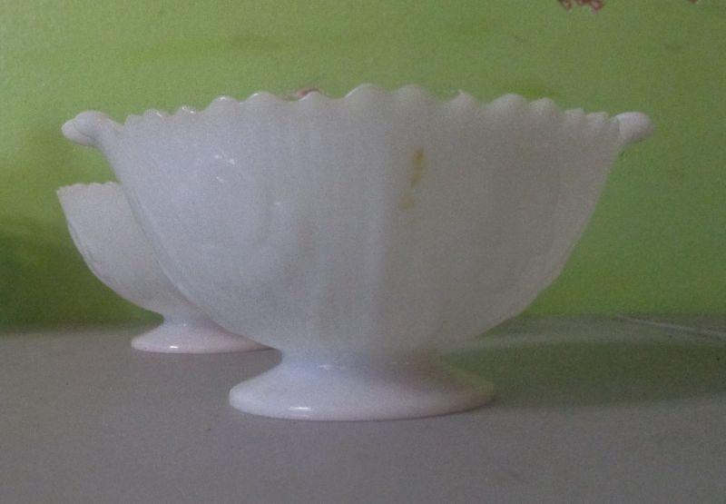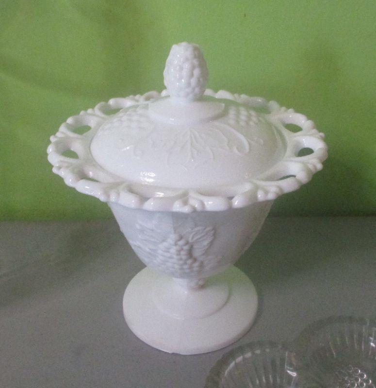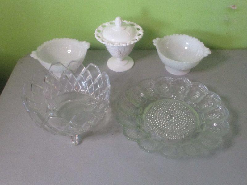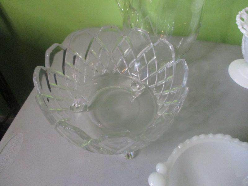 The pitcher is from House of Crystal in Greenville and monogrammed with a capital W. The glass footed bowl is heavy like crystal. The two matching milk glass bowls both have the iris pattern on them. All are in excellent condition.