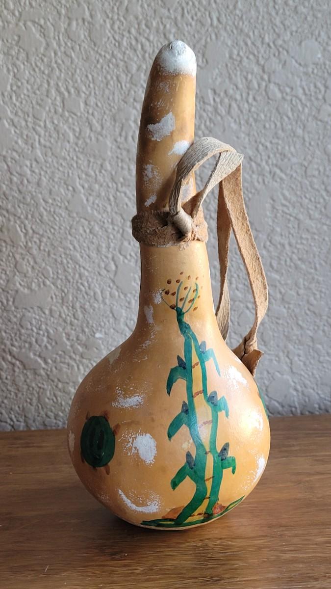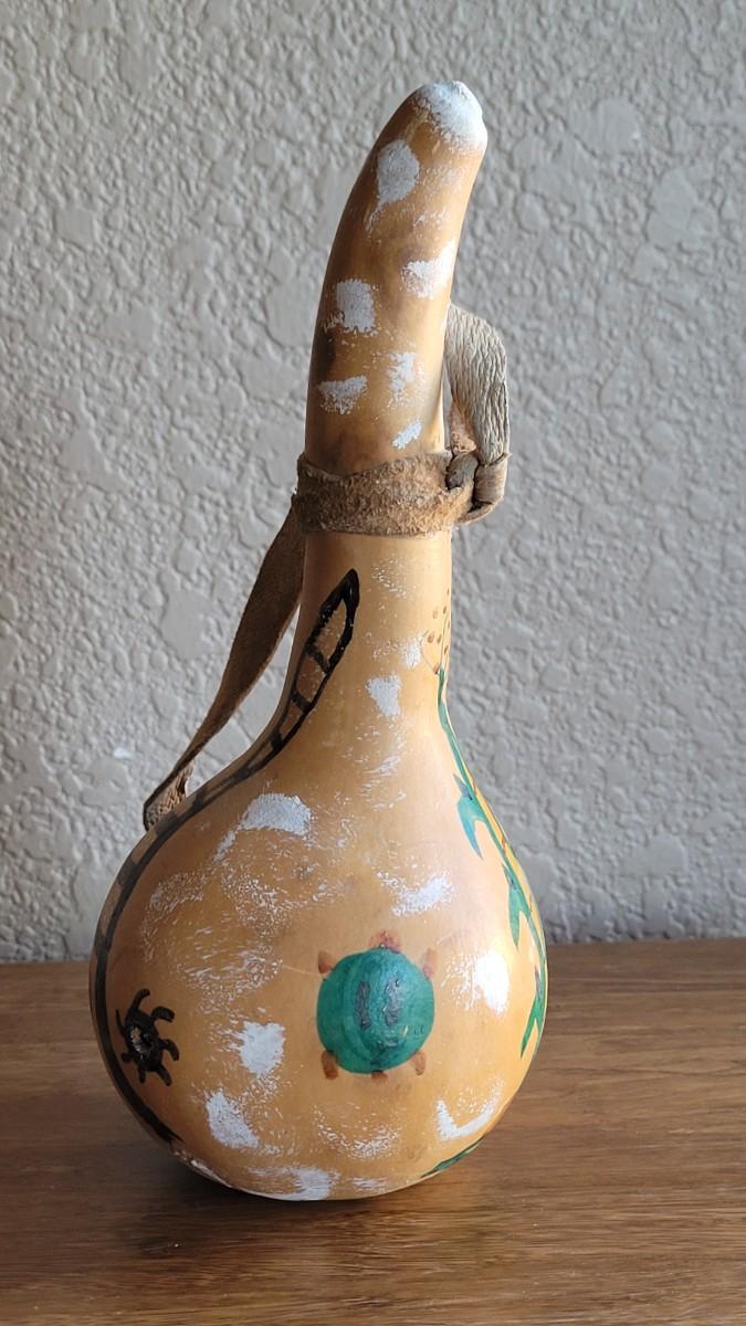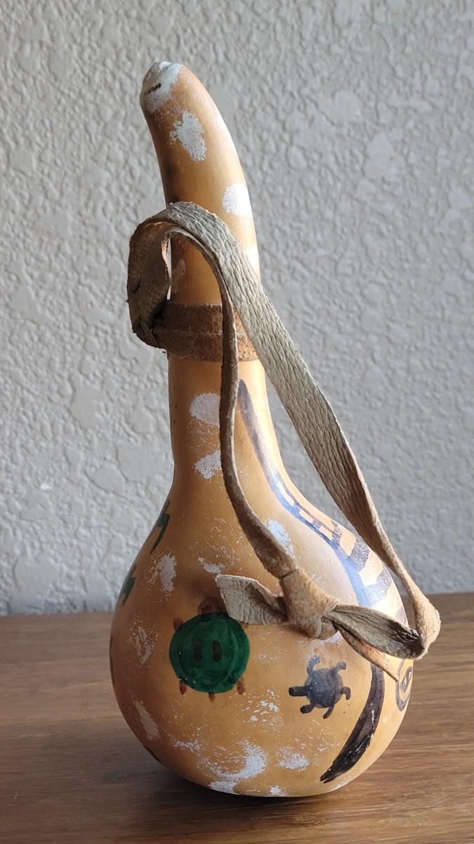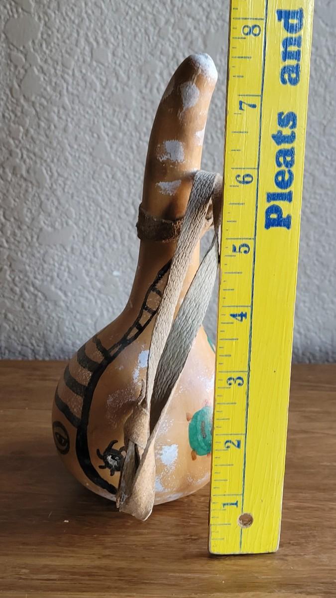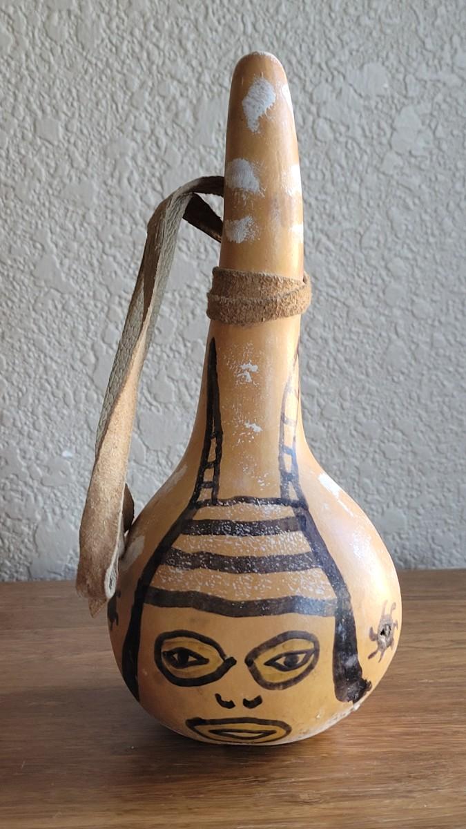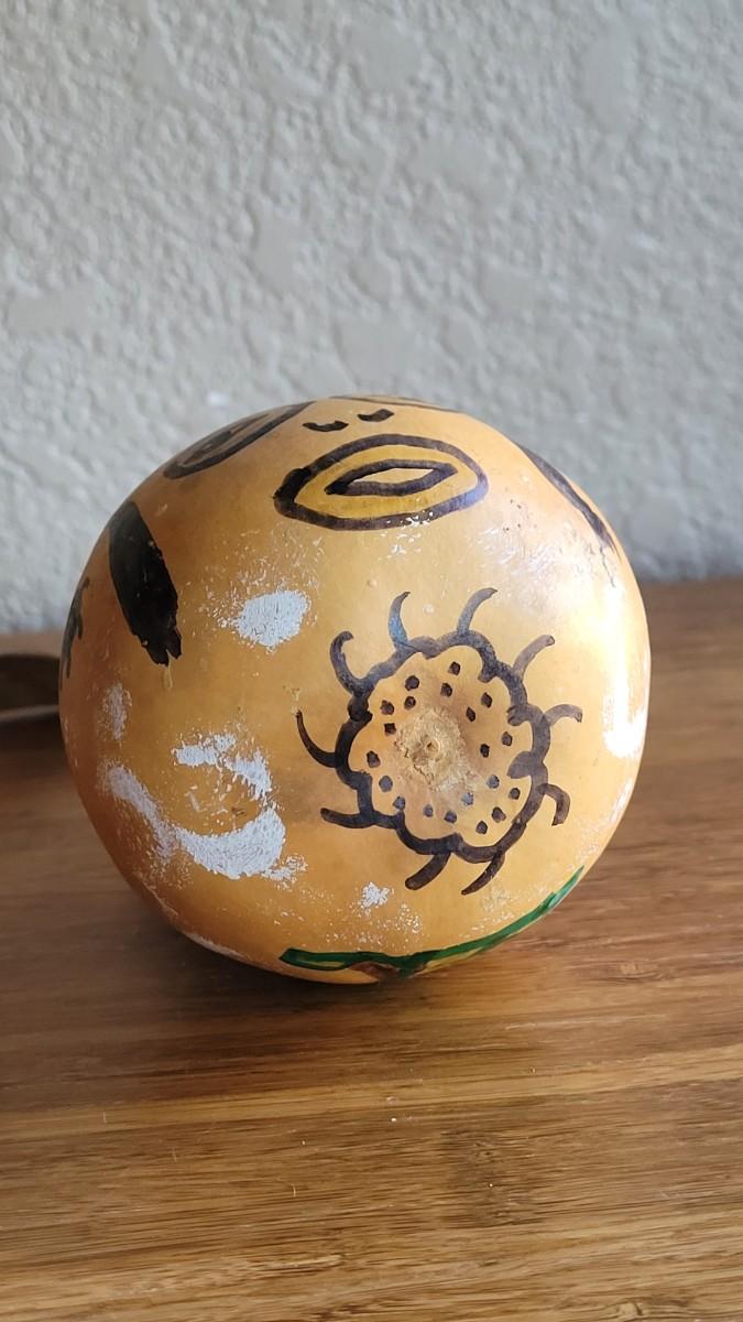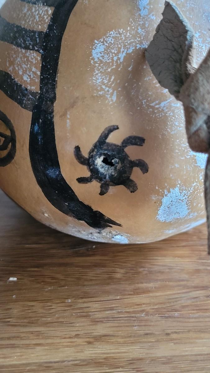 Has what appears to be a joker kachina drawn on it. Gourd has a small hole.