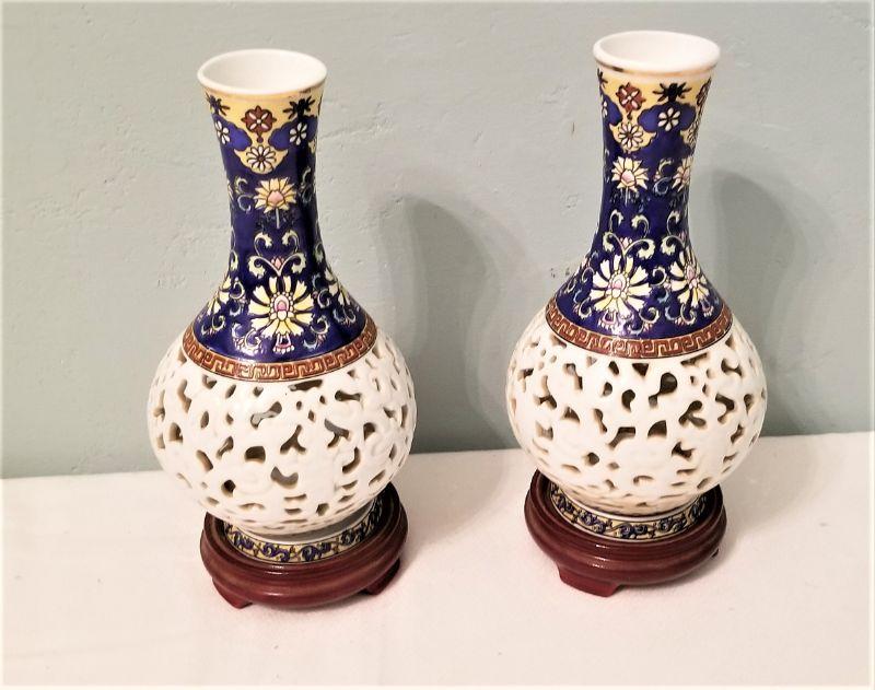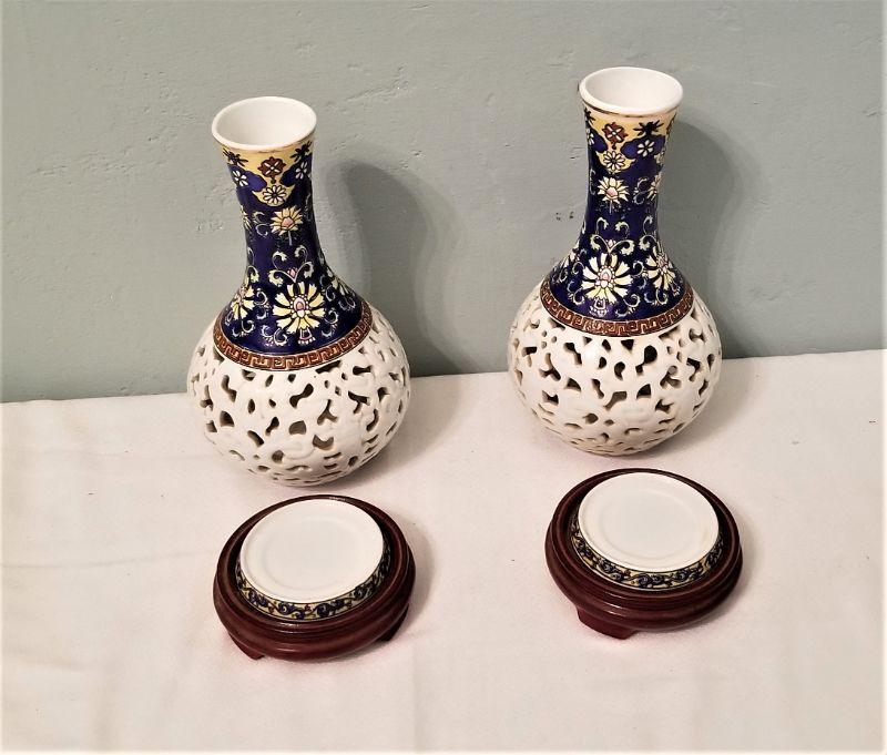 Lot #15 Pair of Pierced Asian Style Vases or Candle Lamps on Stand