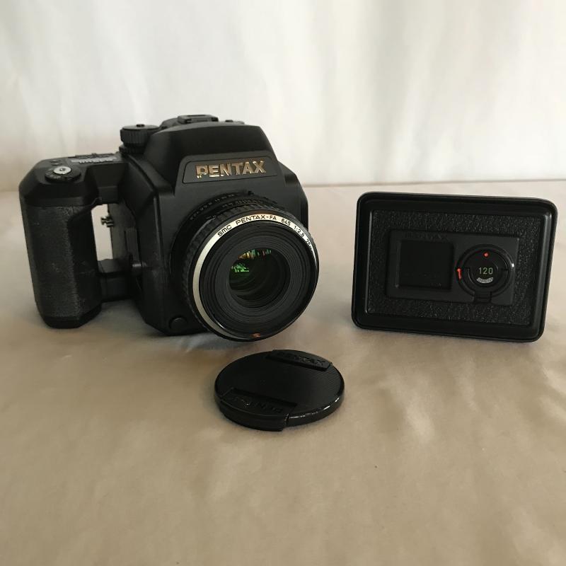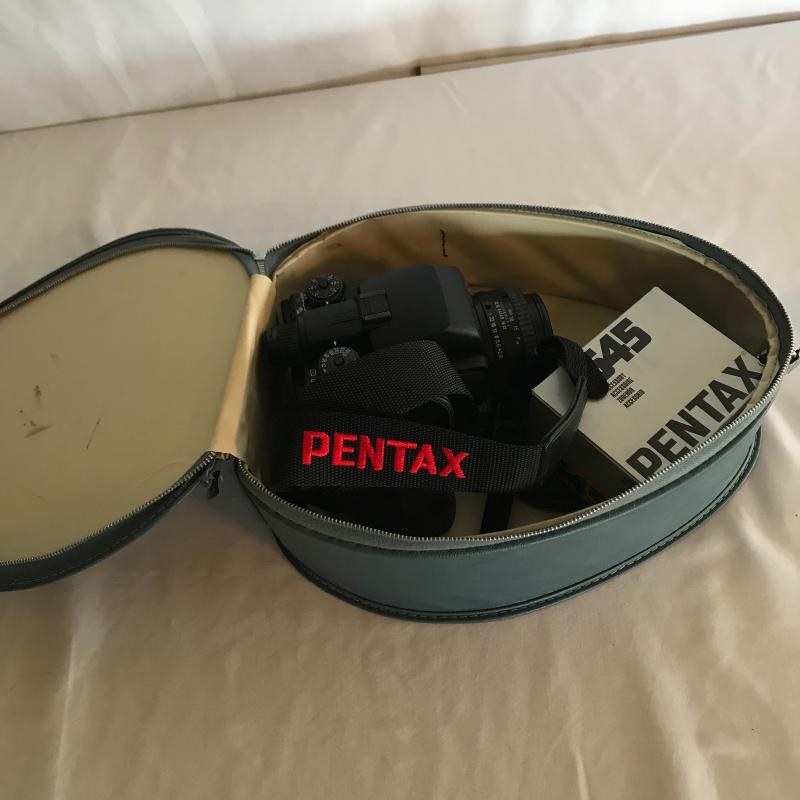This 75mm Pentax appears to be in excellent shape with camera strap and hat box storage. It’s accompanied by a 120 film holder, condition unknown. Local pick up or shipping available.