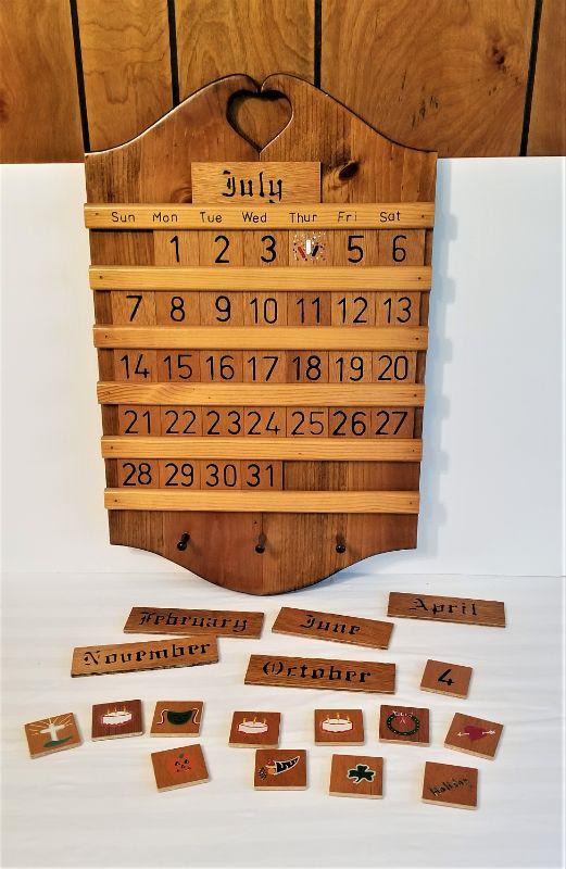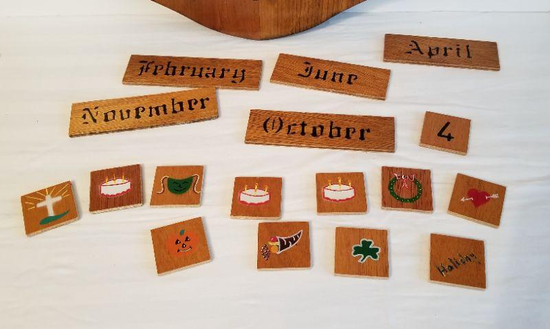 Cute perpetual calendar - complete - has decorative painted tiles for various holidays. 24" tall x 15" wide. Good condition.