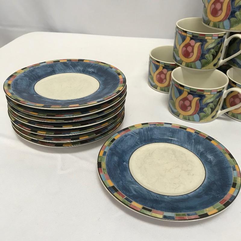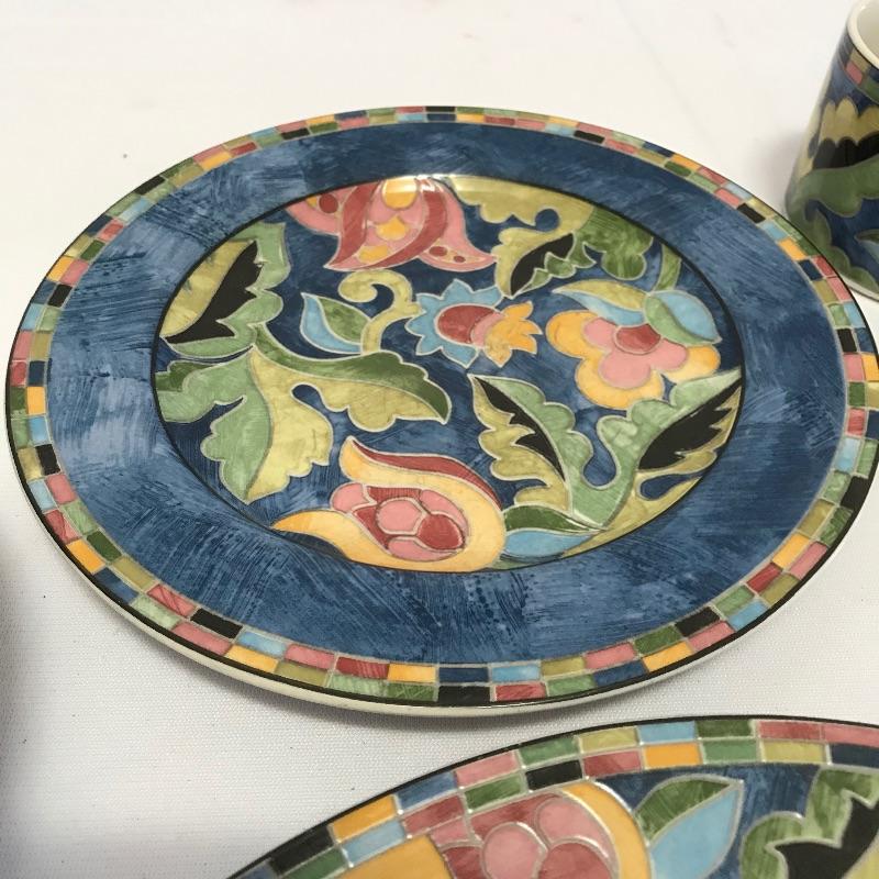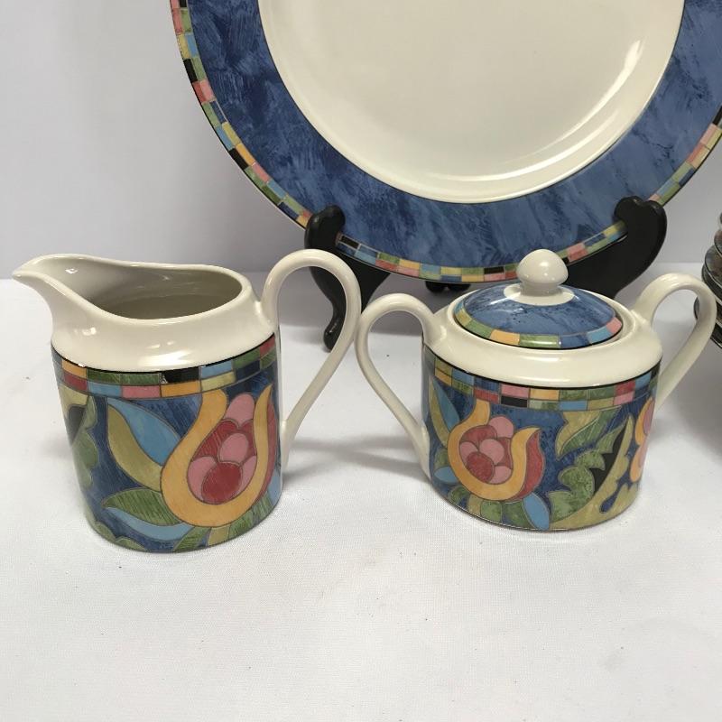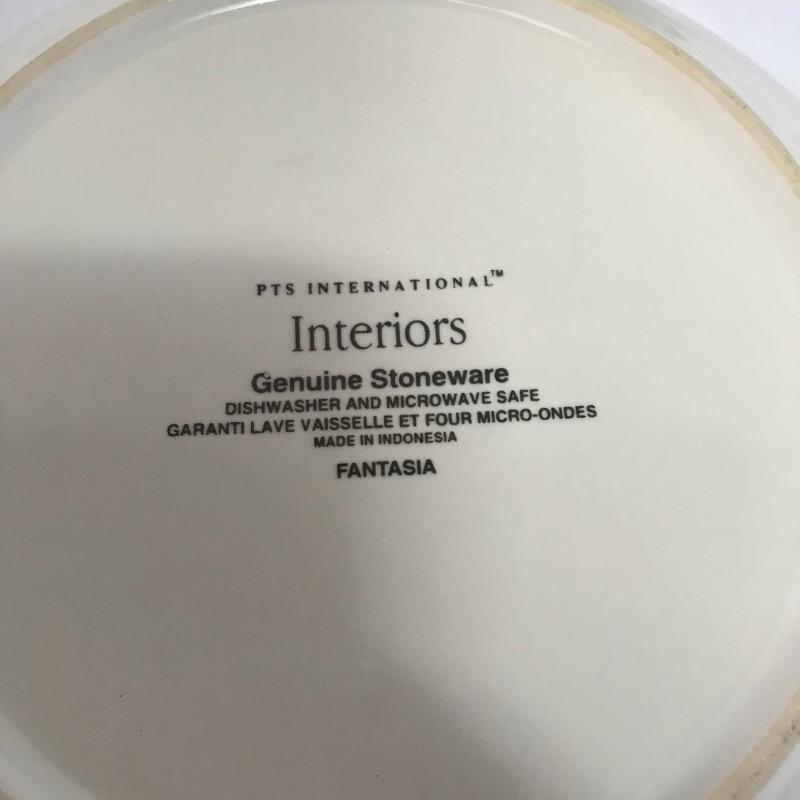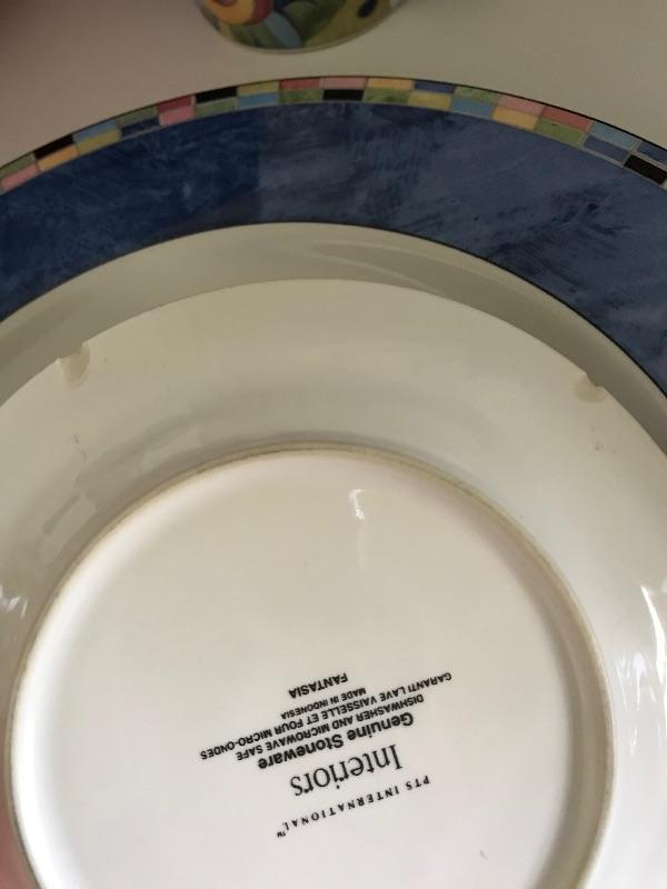 Beautiful, uniquely patterned set “Fantasia” dinnerware by PTS International with a large salad bowl and platter. Dinnerware and serving items are dishwasher and microwave safe. Set includes eight each: cups, saucers, salad plates and bowls. Seven 10.75” dinner plates, one 10”d x 3” bowl and one 12.5” round platter included. There are a few chips on dishes, but most found on the underside of plates and do not affect integrity of dishes. One chip on a salad plate is noted in photos. No shipping.