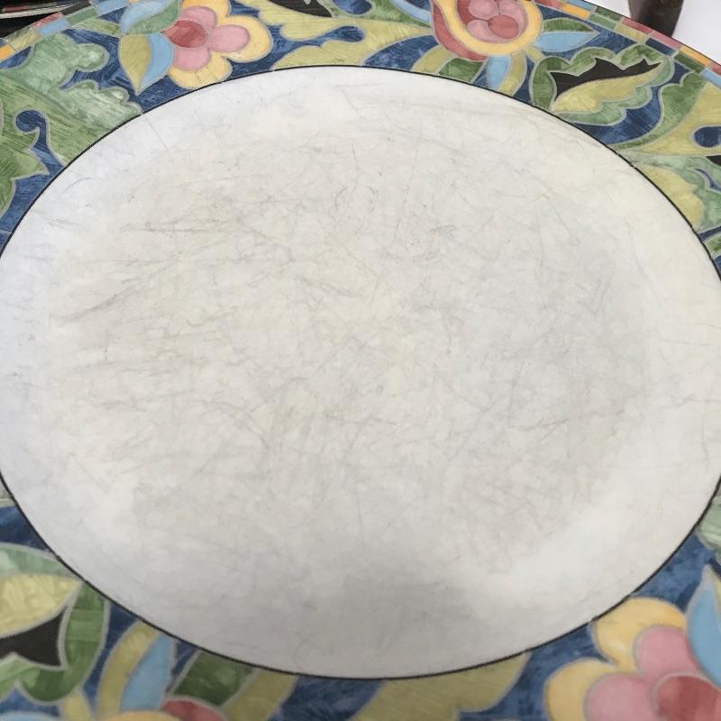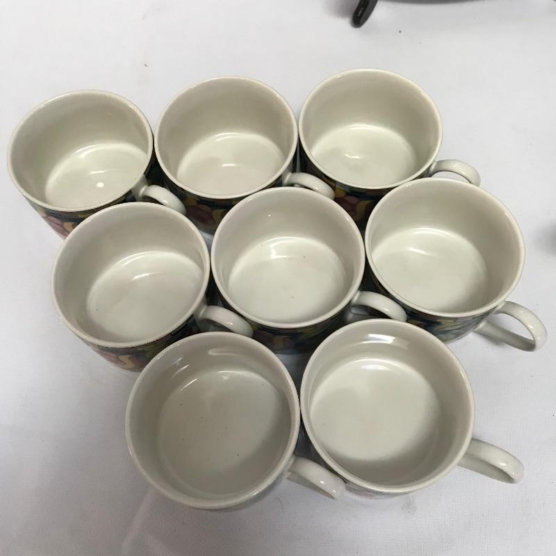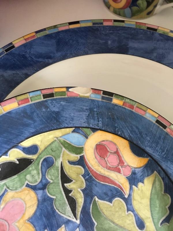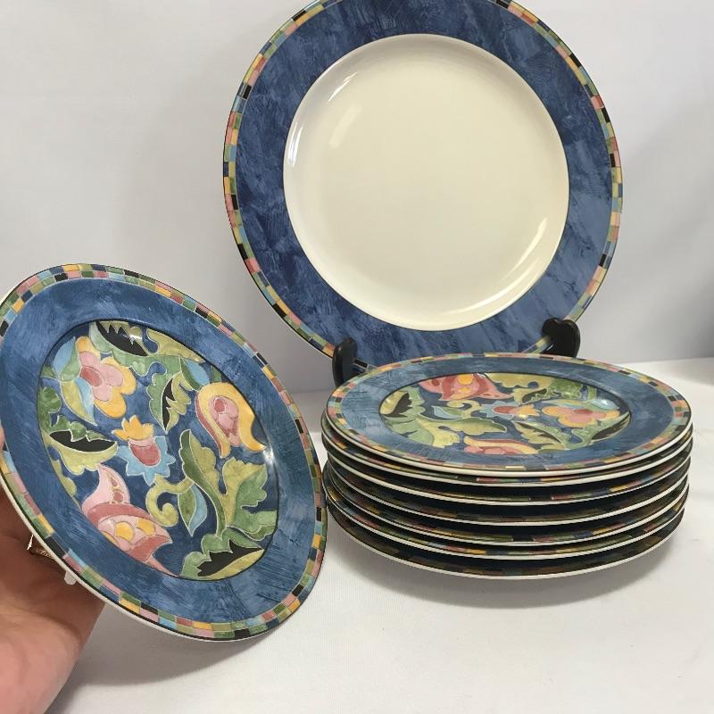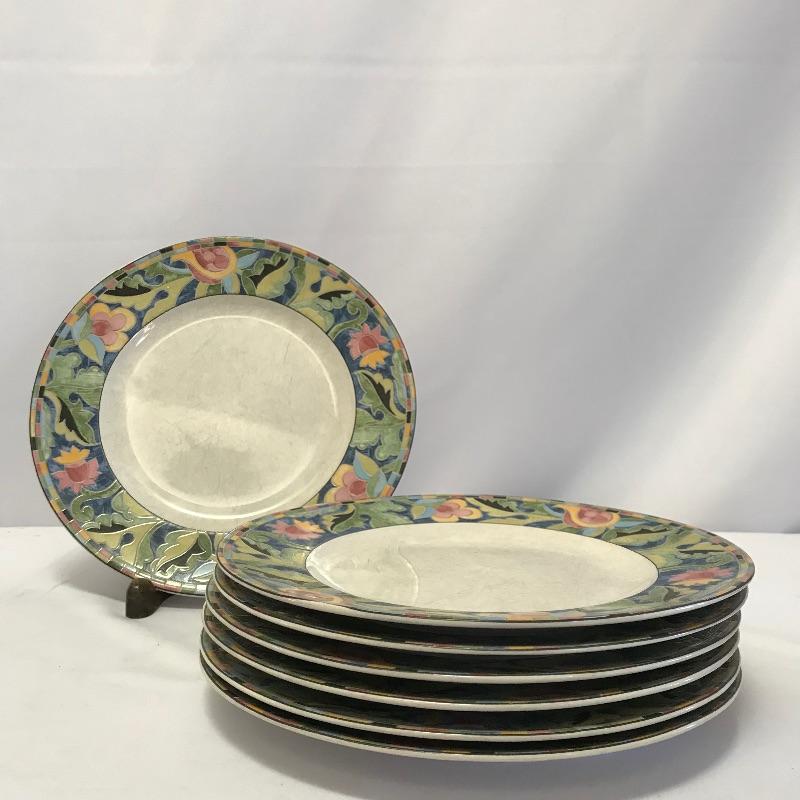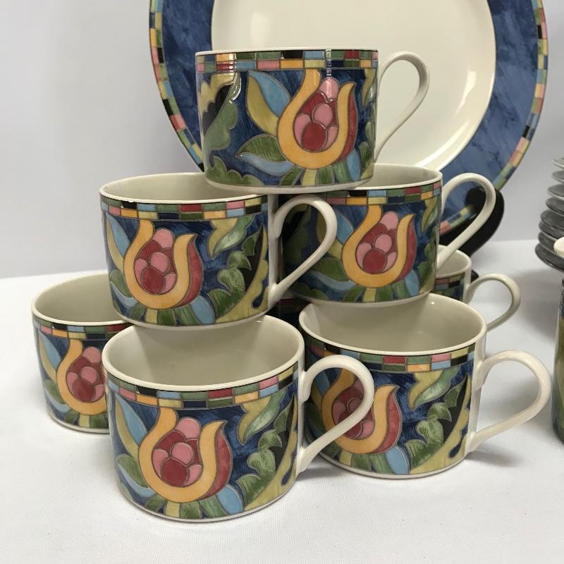Beautiful, uniquely patterned set “Fantasia” dinnerware by PTS International with a large salad bowl and platter. Dinnerware and serving items are dishwasher and microwave safe. Set includes eight each: cups, saucers, salad plates and bowls. Seven 10.75” dinner plates, one 10”d x 3” bowl and one 12.5” round platter included. There are a few chips on dishes, but most found on the underside of plates and do not affect integrity of dishes. One chip on a salad plate is noted in photos. No shipping.