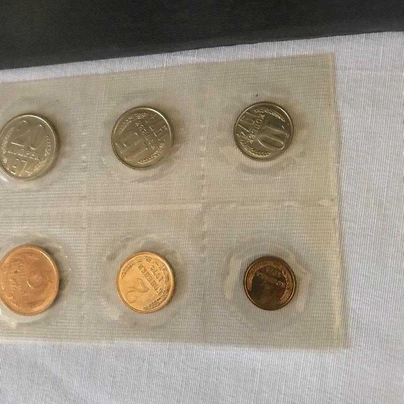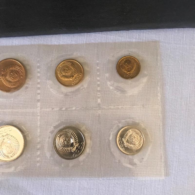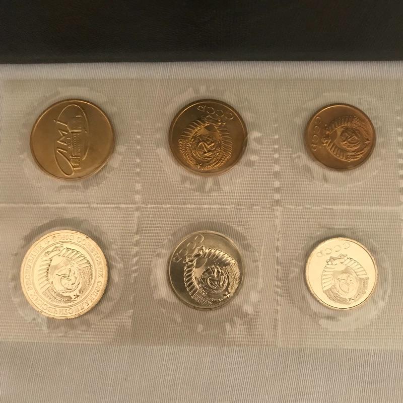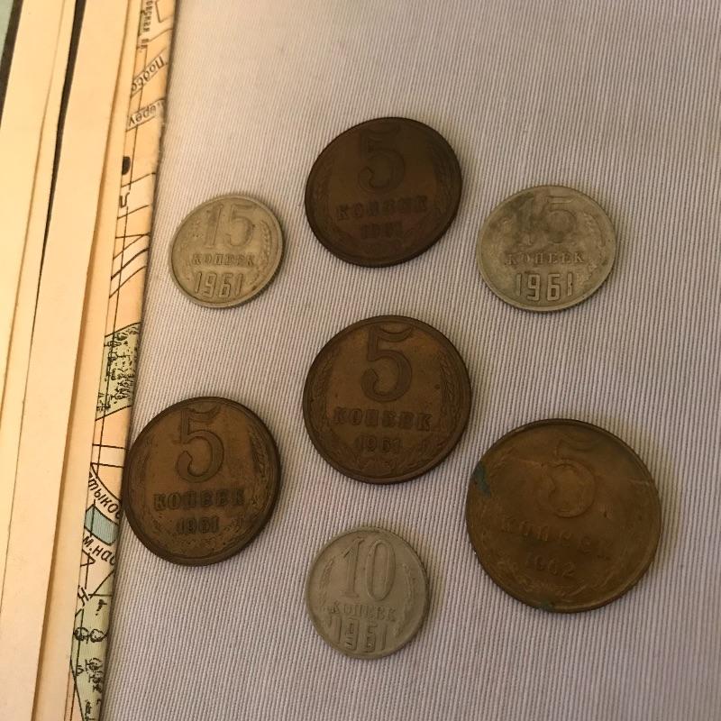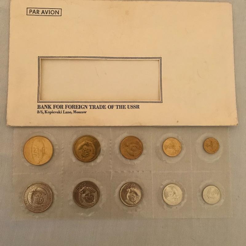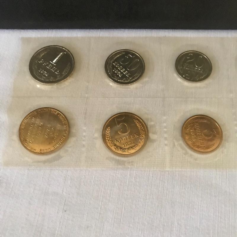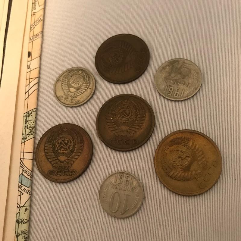 Thirteen pins, 1974 set appears proof, loose coins from 1961 and 62 and a map of Moscow.
