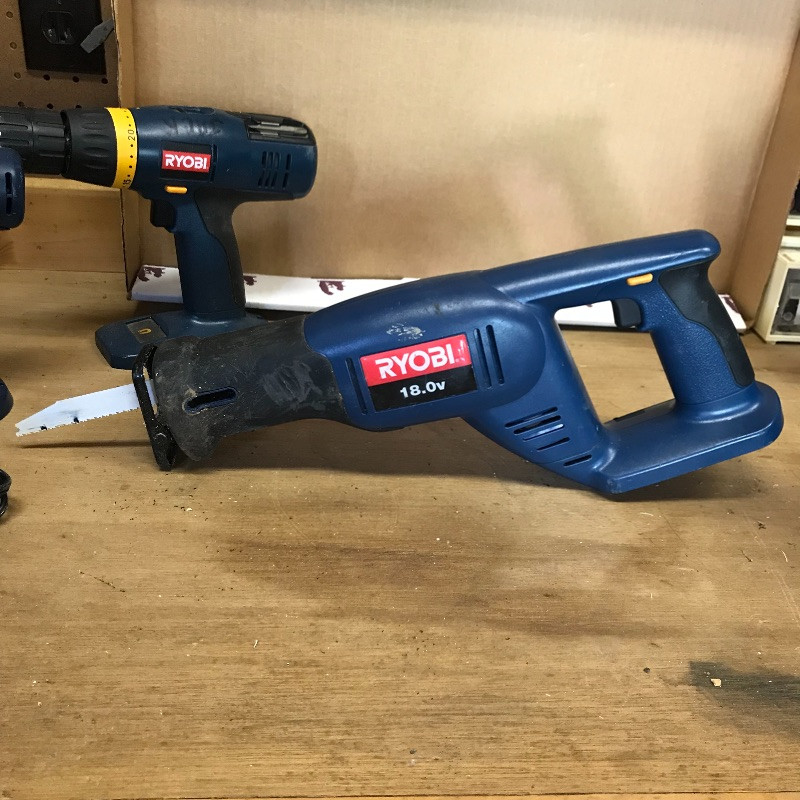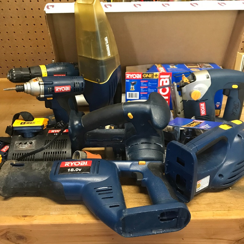 A perfect starter collection of power tools. to get you going with all kinds of projects. These tools all take the same 18v battery, not included. This assortment has a charger for 18v battery, two Tuff Sucker Wet/Dry handheld vacuums with accessories, jig saw with extra blades, two drills 5 1/2 circular saw, reciprocating saw, one + trimmer in like-new condition with box and three Ryobi bottom hooks with lanyard attachments, see images.