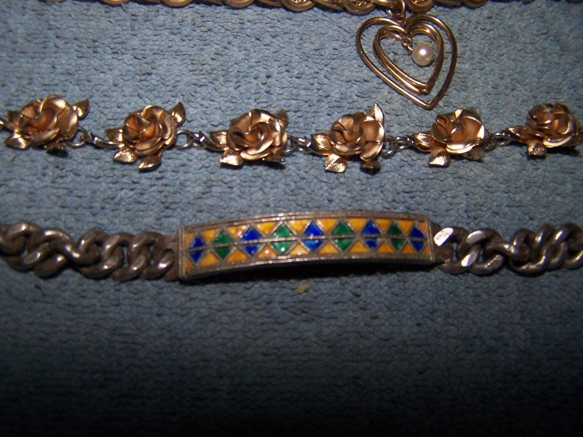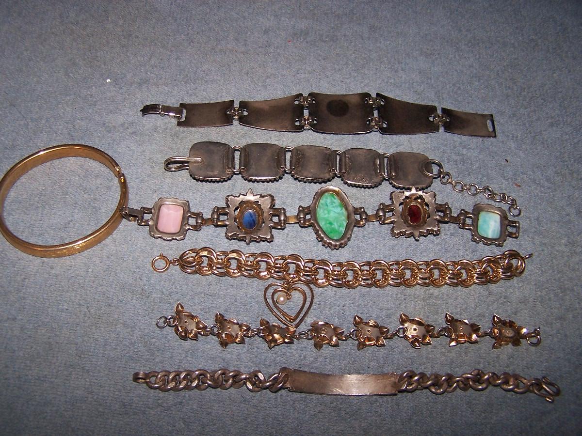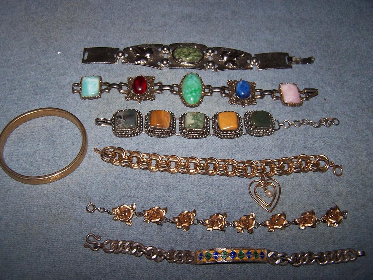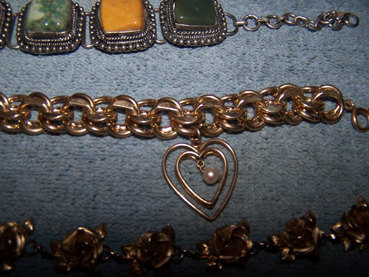 7 WONDERFUL VINTAGE BRACELETS... 3 ARE MARKED GOLD FILLED-BANGLE/ROSES/HEART BRACELETS...