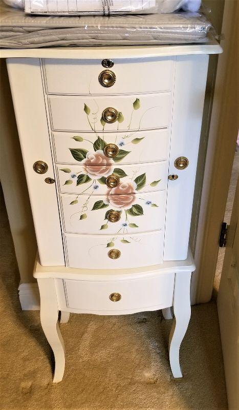 Nice little shabby chic jewelry armoire here - designed by Thomas Paconi - has instructions and working key so it can be locked. 12" deep, 16" across, 37.5" tall.