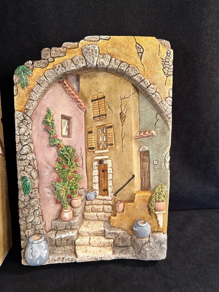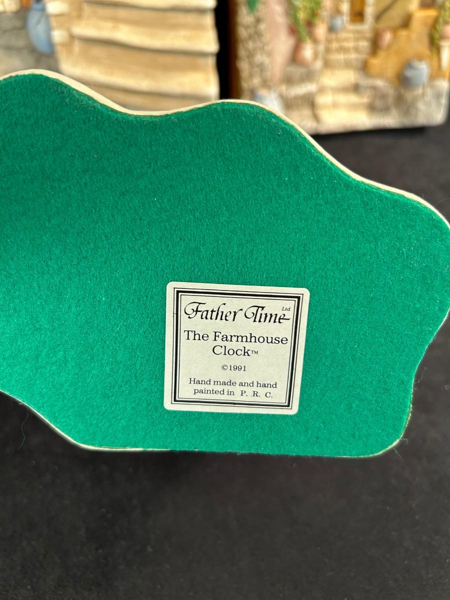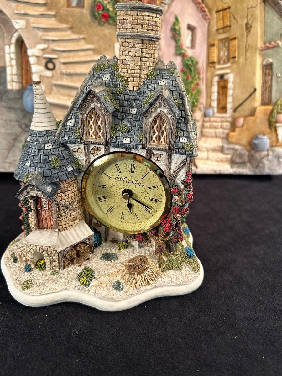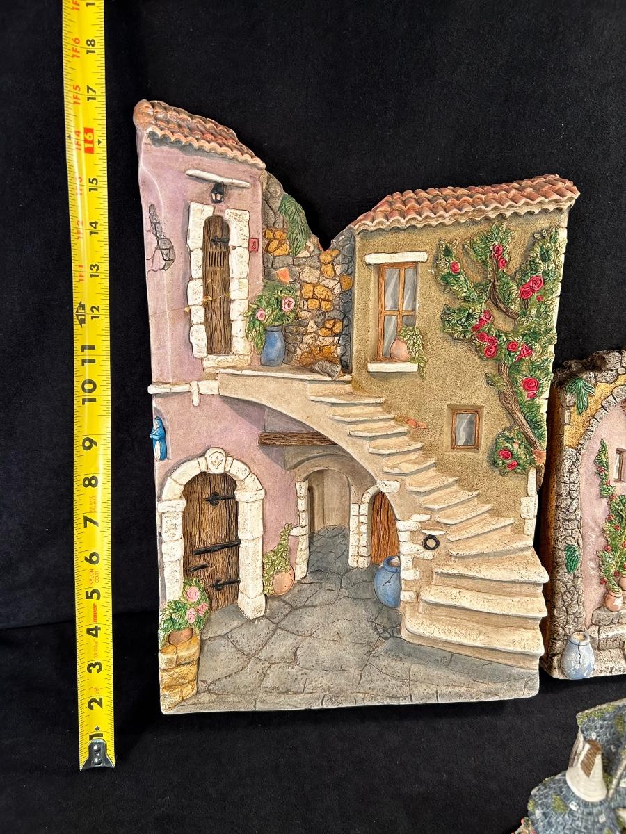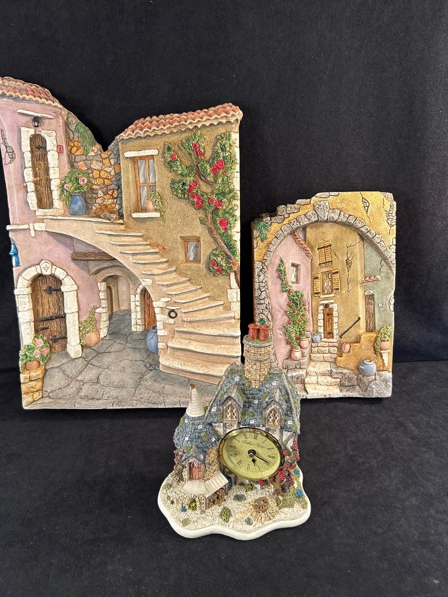 two pottery wall decor pieces. and one clock figurine