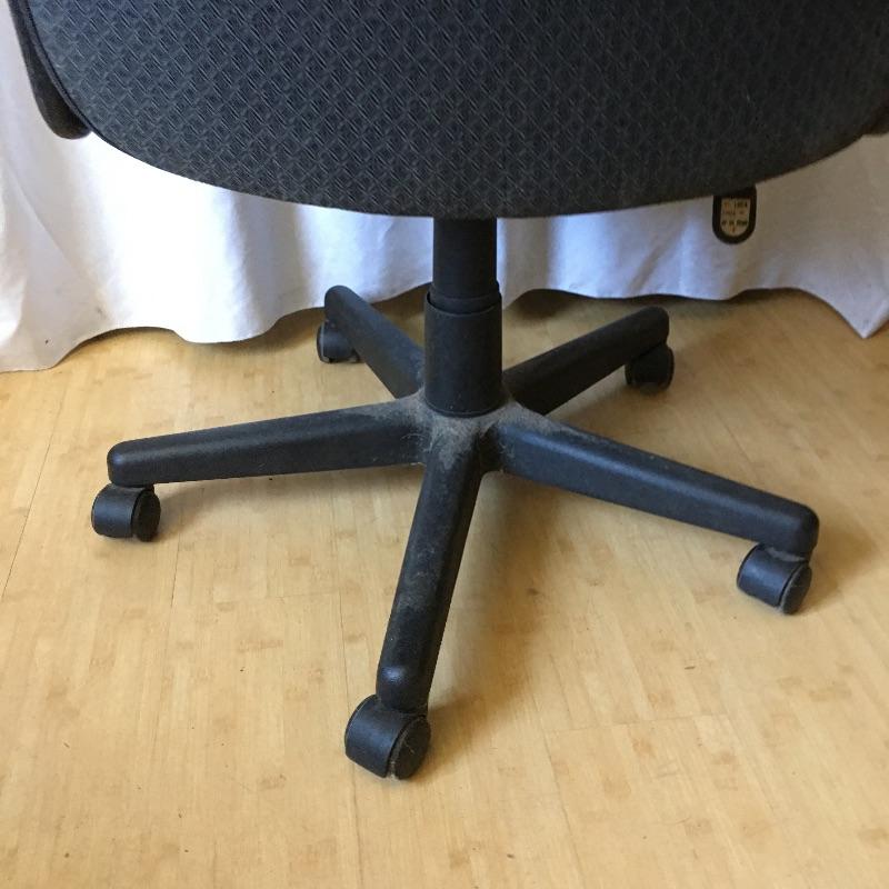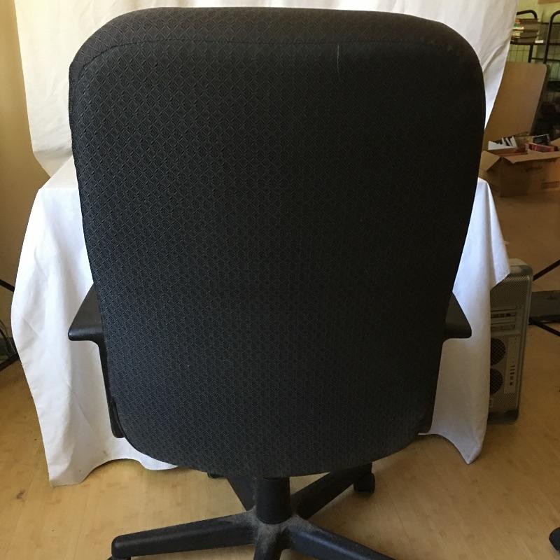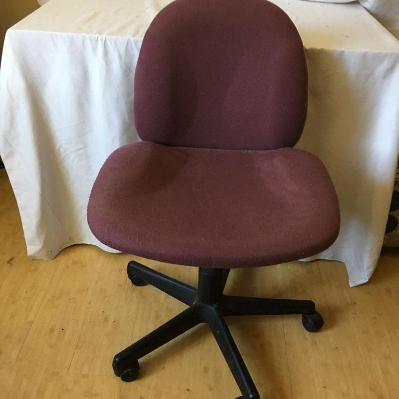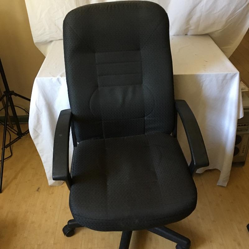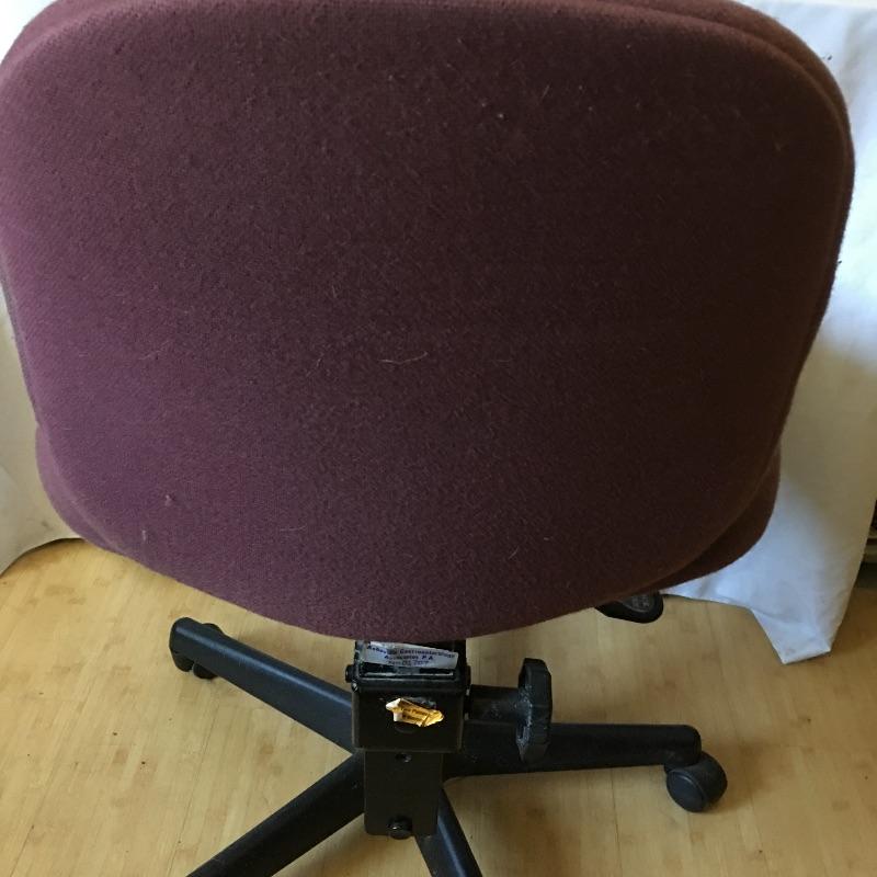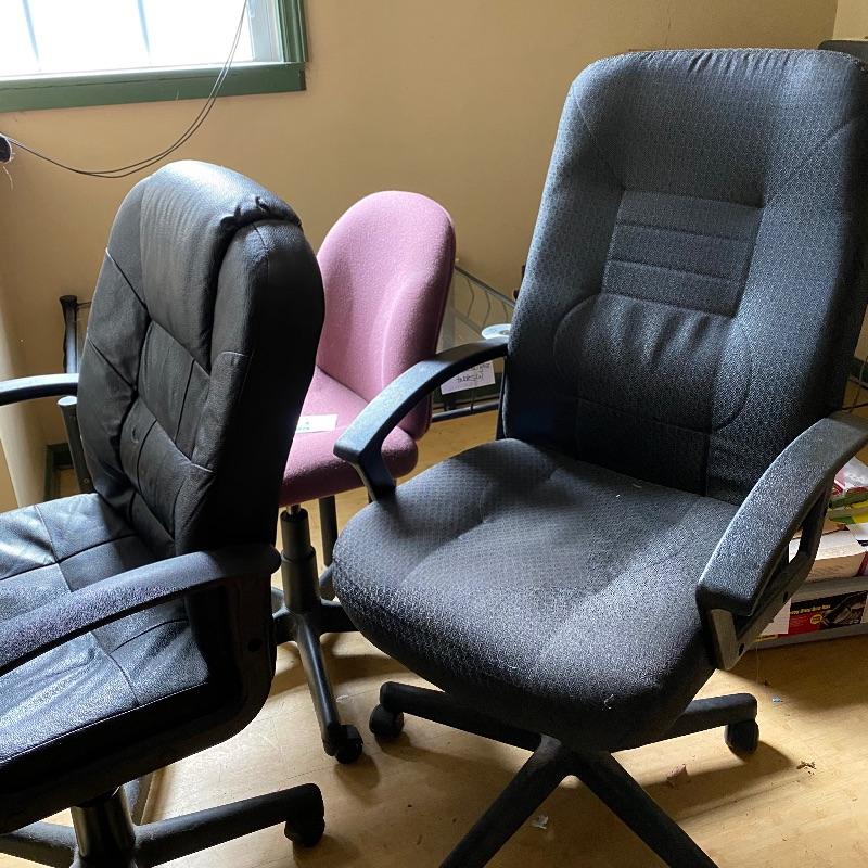 Trio of office chairs. Try them all and keep your favorite. Lot includes two office chairs with arms and one without arms. Two chairs are fabric and one is vinyl. There is quite a bit of animal hair on these chairs. Largest chair measures 27” x 27” x with a adjustable height.
