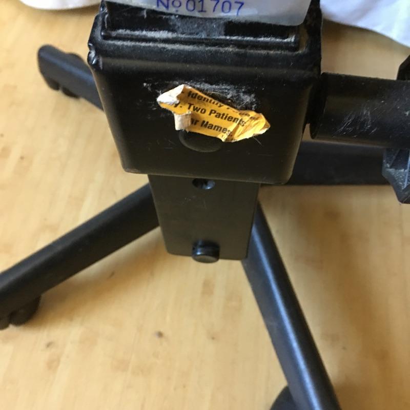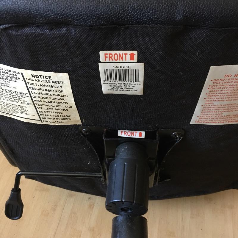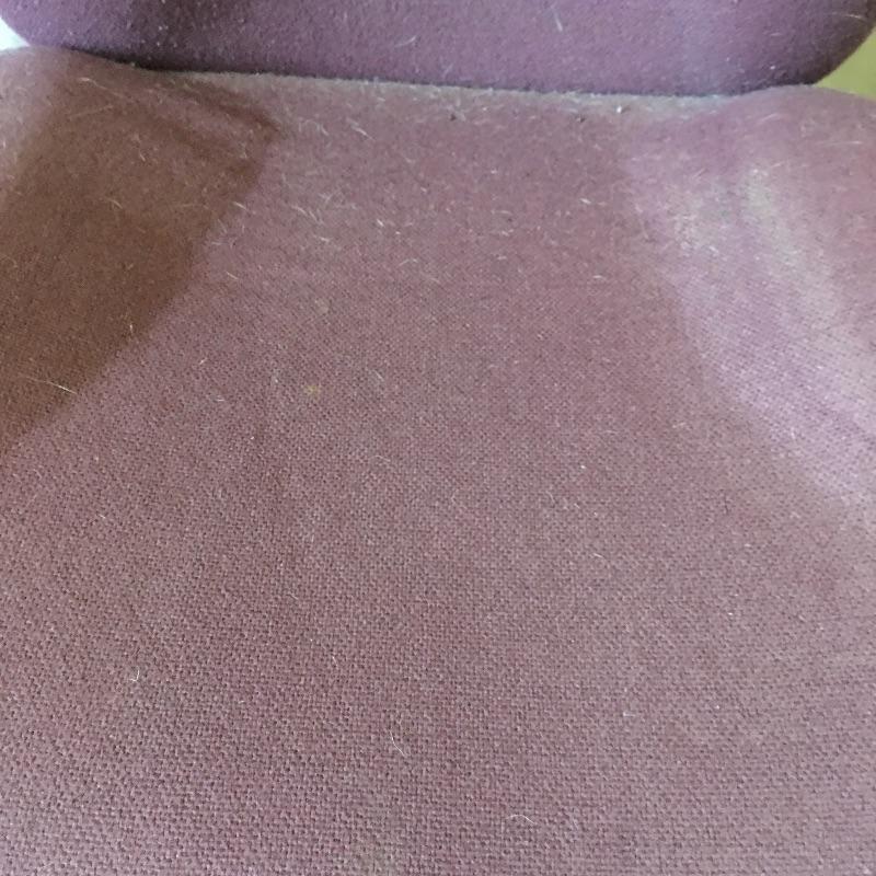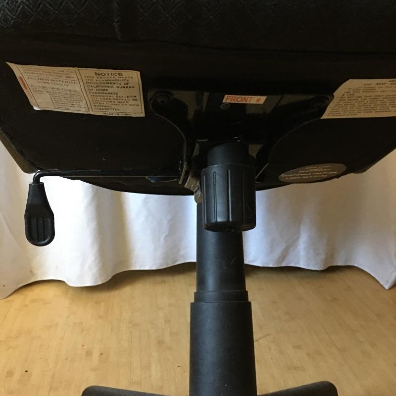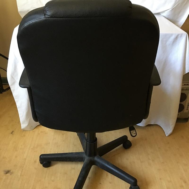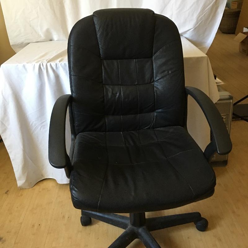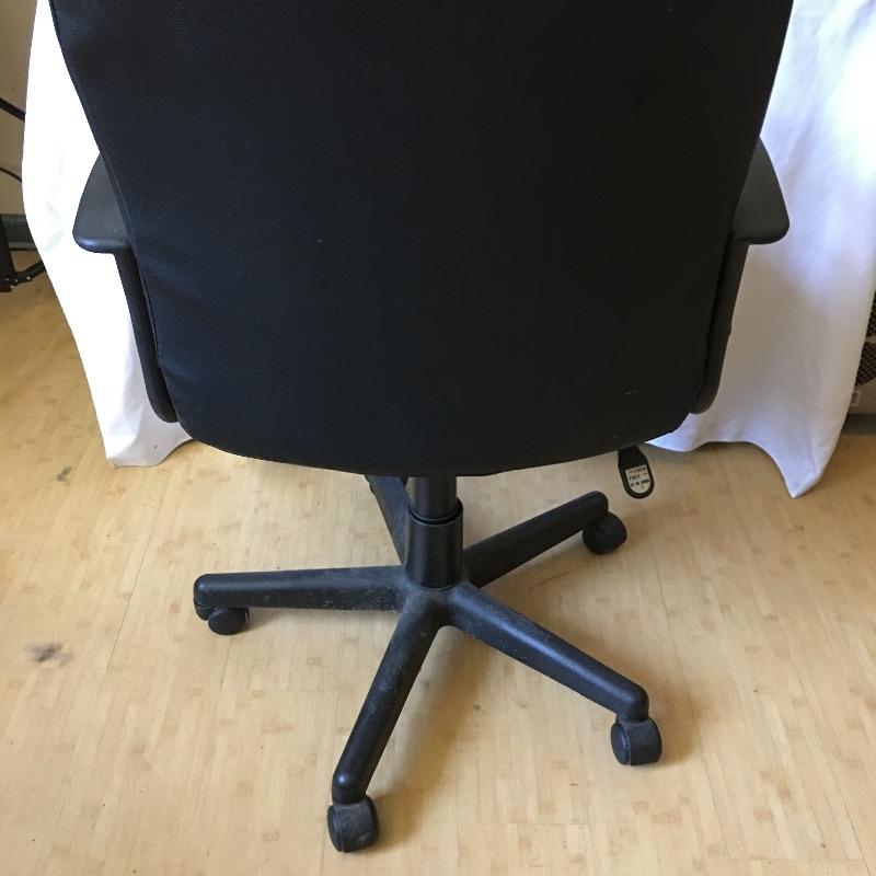 Trio of office chairs. Try them all and keep your favorite. Lot includes two office chairs with arms and one without arms. Two chairs are fabric and one is vinyl. There is quite a bit of animal hair on these chairs. Largest chair measures 27” x 27” x with a adjustable height.