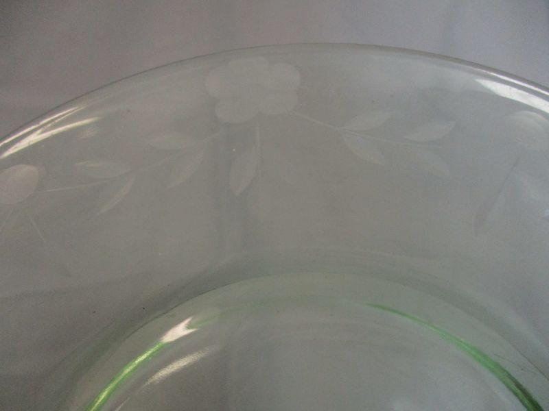 These have a pretty etched pattern of a flower and then vines connecting the individual flowers. There is light surface scratches, but I didn't see any chips. Some of the plates have very tiny air bubbles in them. Matches Lot 14 and these are about 7.5" in diameter.
