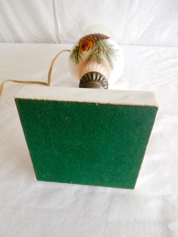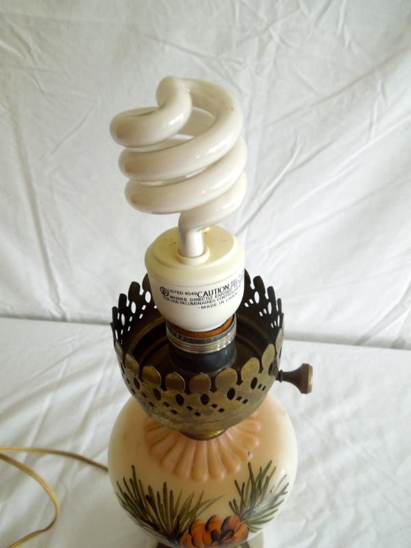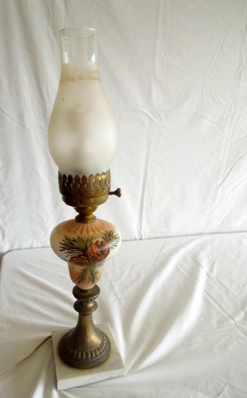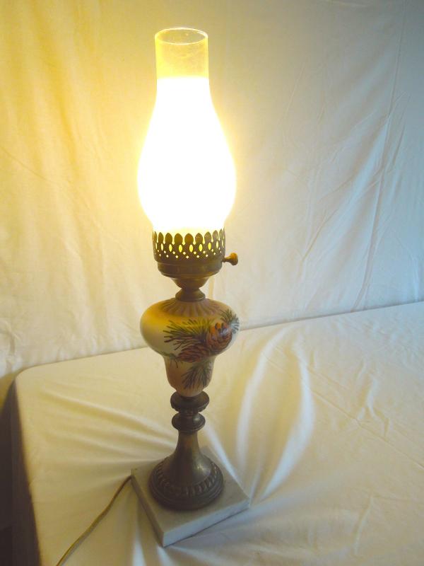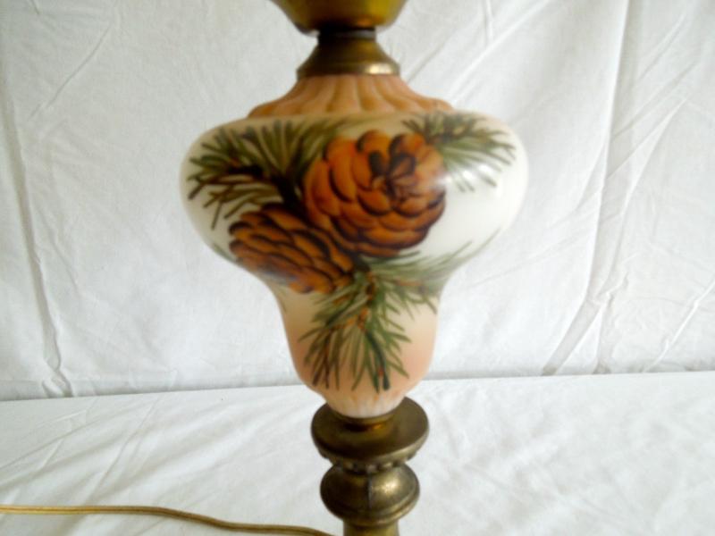 Nice pine cone hand painted detail on base. Glass hurricane is heavily soiled. Original outdated cord. In working condition. 22" high. Base 5" x 5".