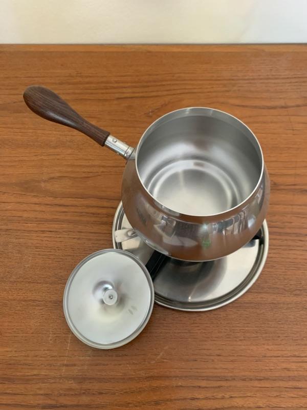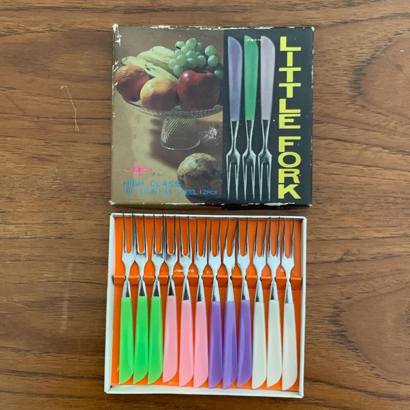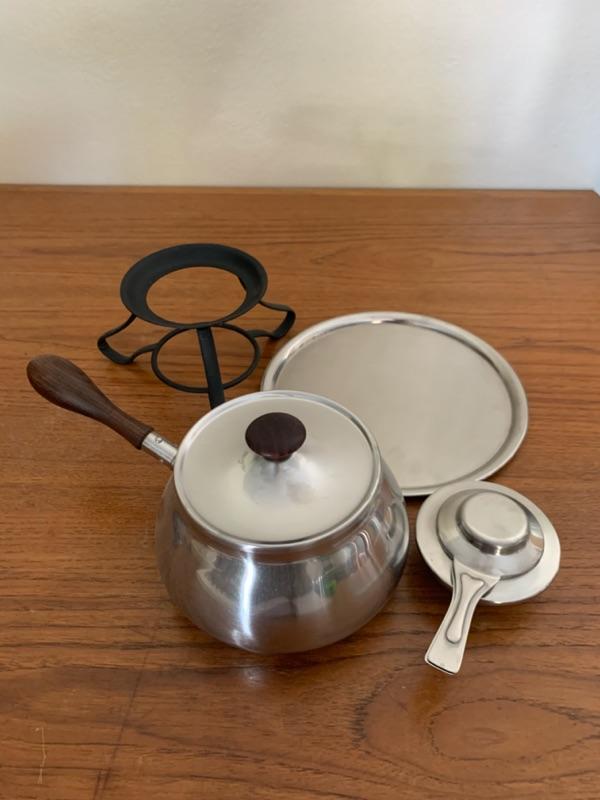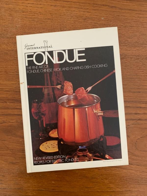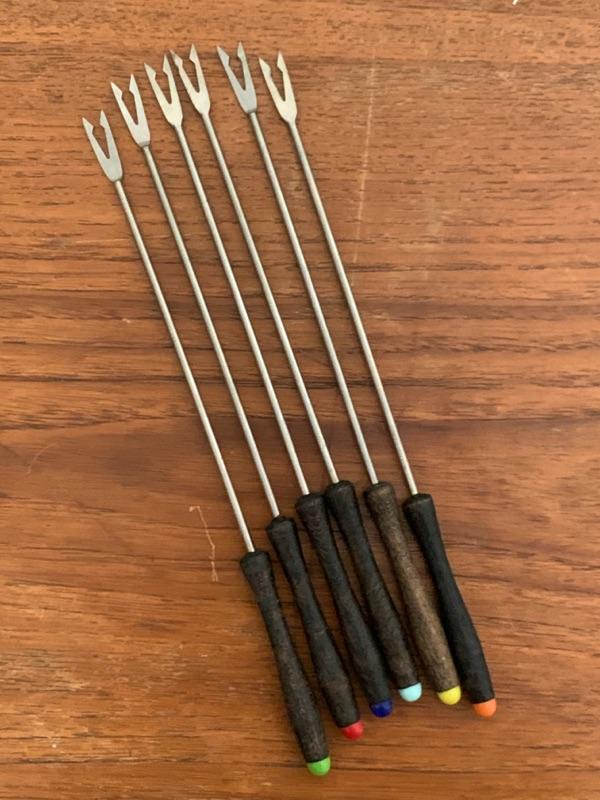 Vintage Stainless Steel Fondue Pot with 6 forks and recipe book. Appears to have little or no use. Forks show some age wear on wood handles.