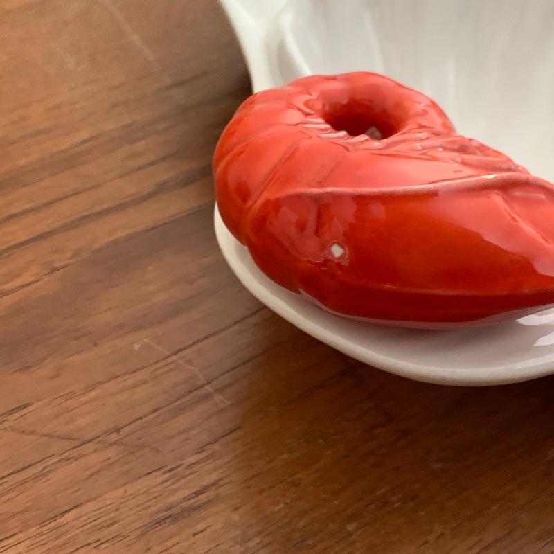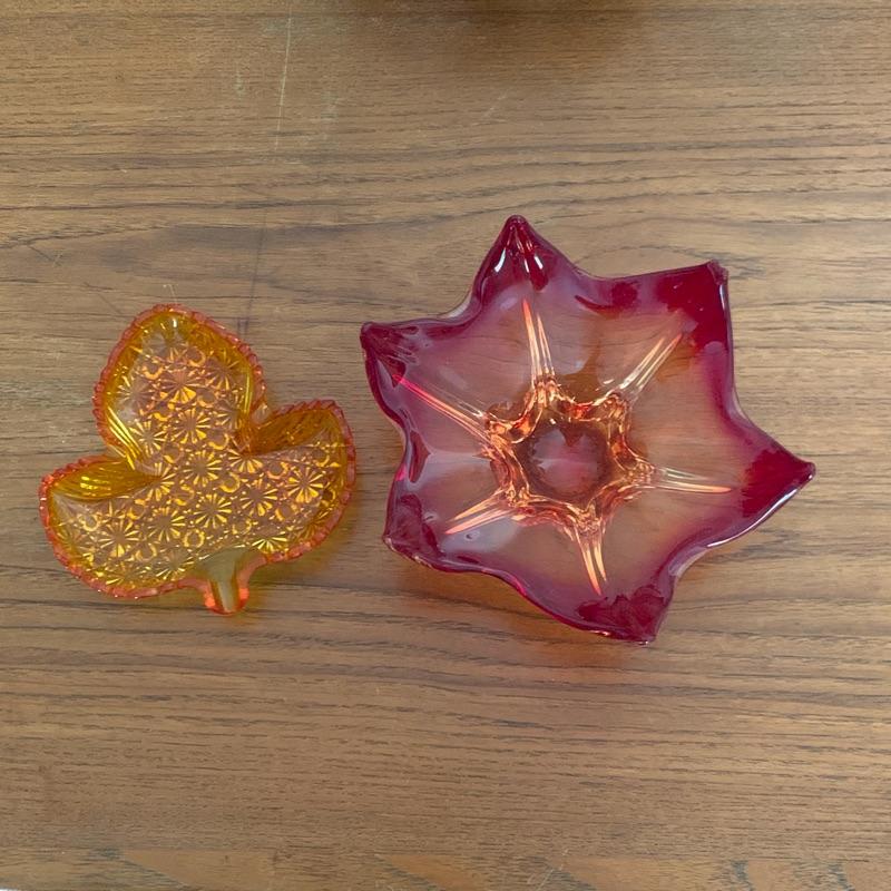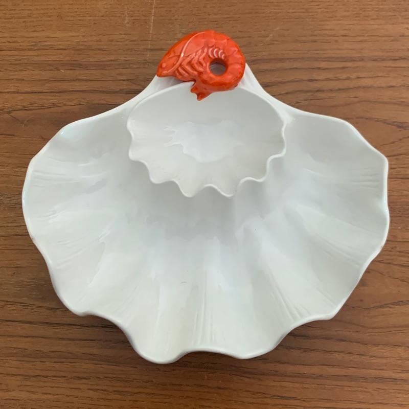 Ceramic shell shaped shrimp serving dish. Tiny chip on top of shrimp, no cracks or repairs. "Made in USA" stamped on back. 12 1/2' x 11 1/2'. Orange atomic star cut, leaf shaped dish. 7' x 6 1/4" - excellent condition.