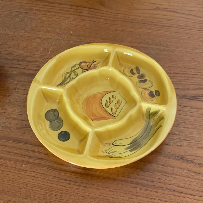 Mustard yellow, ceramic divided relish /condiment dish, stamped "Los Angeles Pottery, 1970." Tiny chip on rim. No cracks or repairs. 14" diameter.