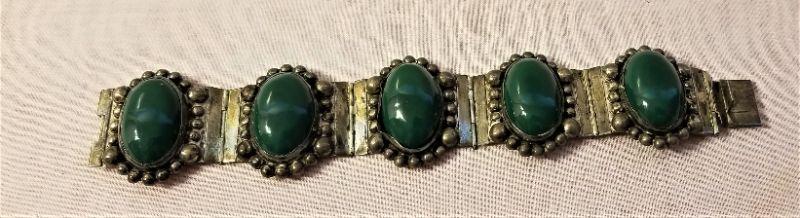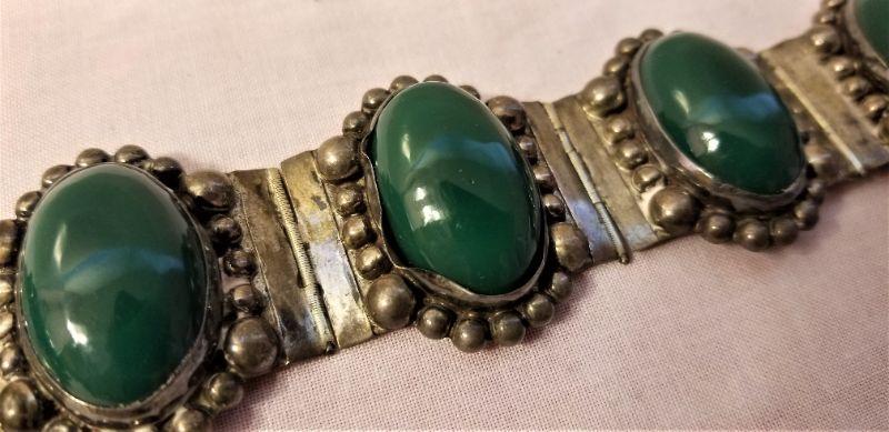 Vintage Mexican Sterling Silver (marked) bracelet with green stones. 7.25" long. Note damage to mount border of one stone. Clasp works fine.