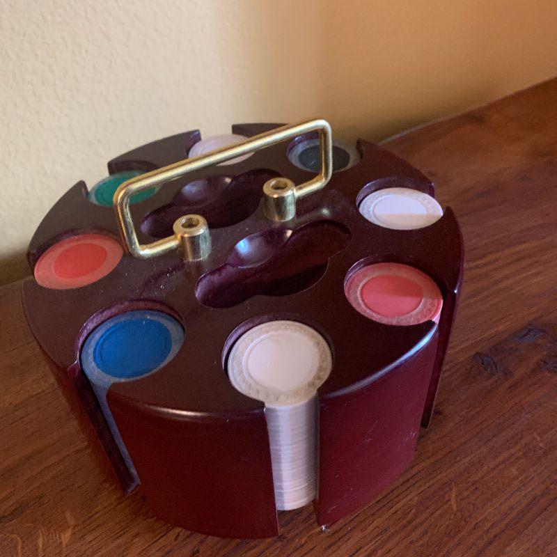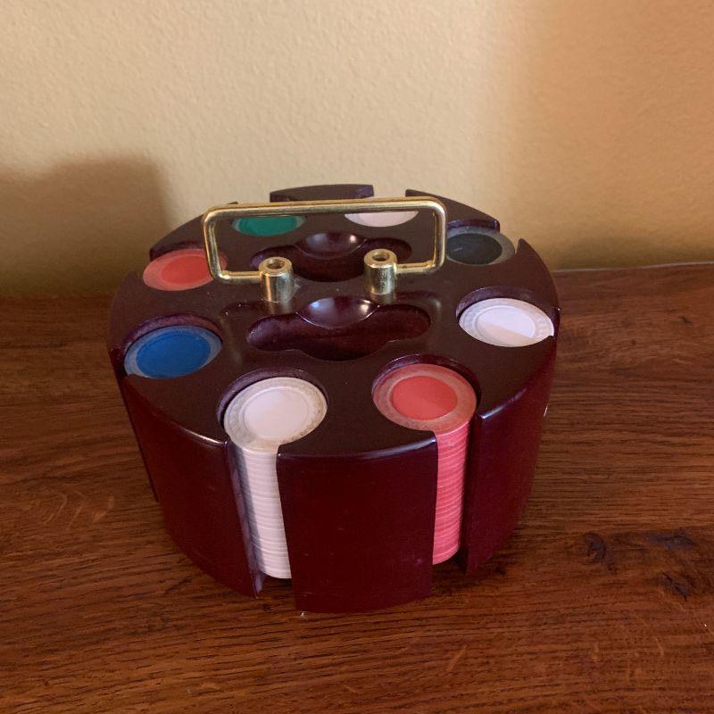 LOT 15 VINTAGE POKER CHIPS AND RACK
