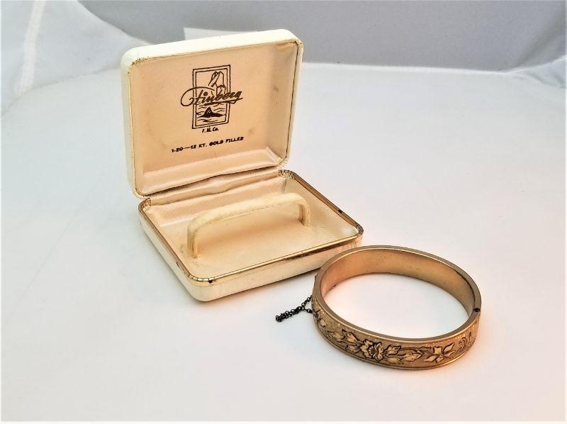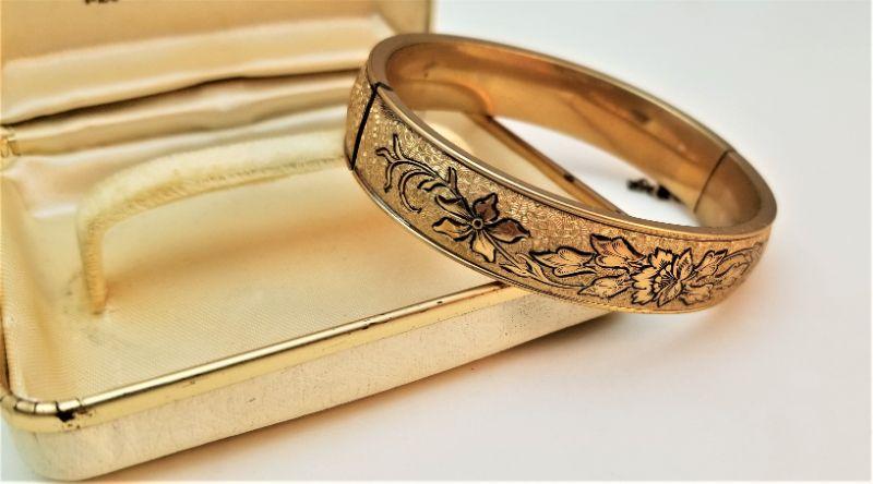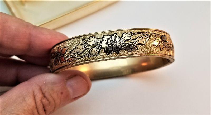 Classic beauty and I can tell you these are getting harder and harder to find in good condition. Lovely vintage Taille d'epergne bangle bracelet in original box. Gold filled with delicate black enameling. Clasp works fine. Should easily fit up to an 8 inch wrist. Measures 1/5" wide. Victorian Revival - from the 1940's or so.