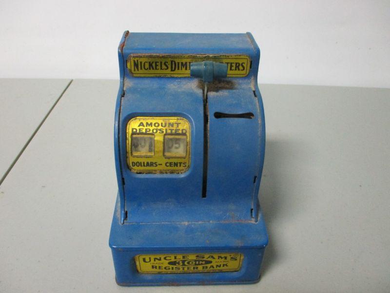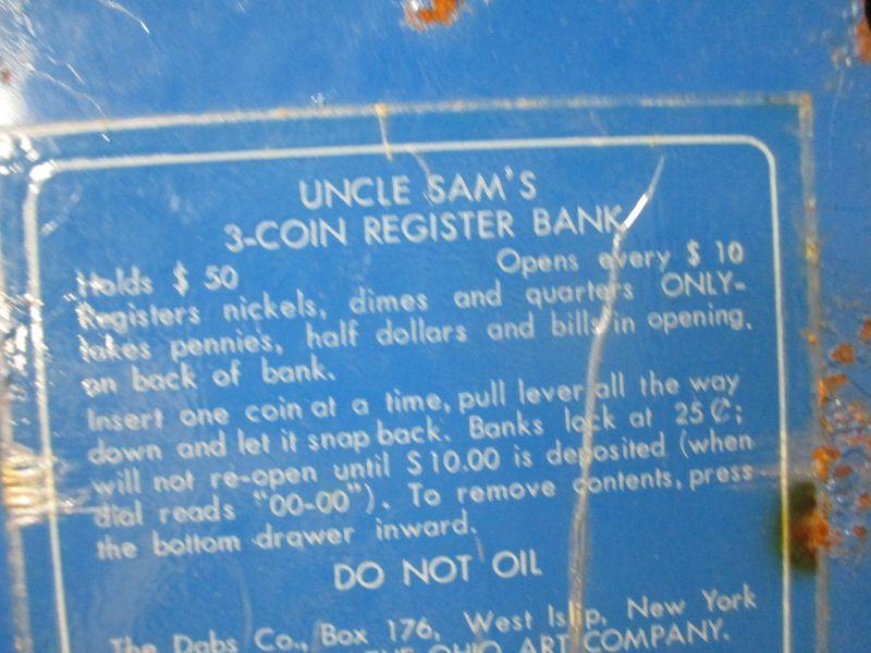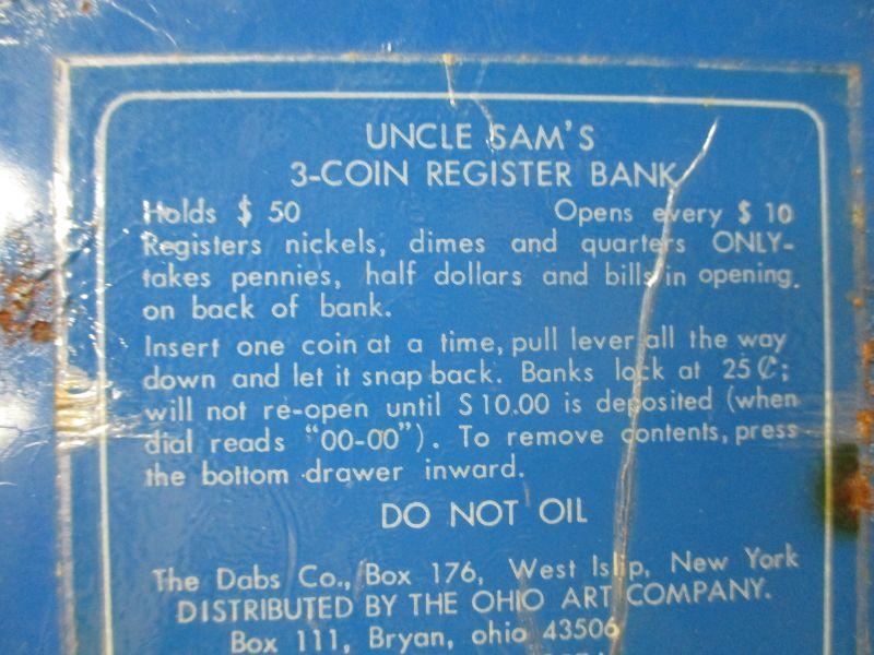 Lot 154 - Vintage Uncle Sam's 3 Coin Register Bank Blue Metal