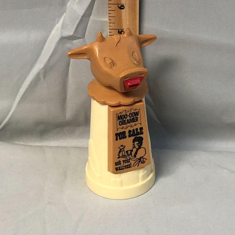 If I found the correct history, these used to sit on the tables at a restaurant and you poured creamer directly from them. You could buy ones that were never used to take home. This appears to be one of those as it doesn't show any signs of use. Excellent condition! It stands about 6.25" tall.