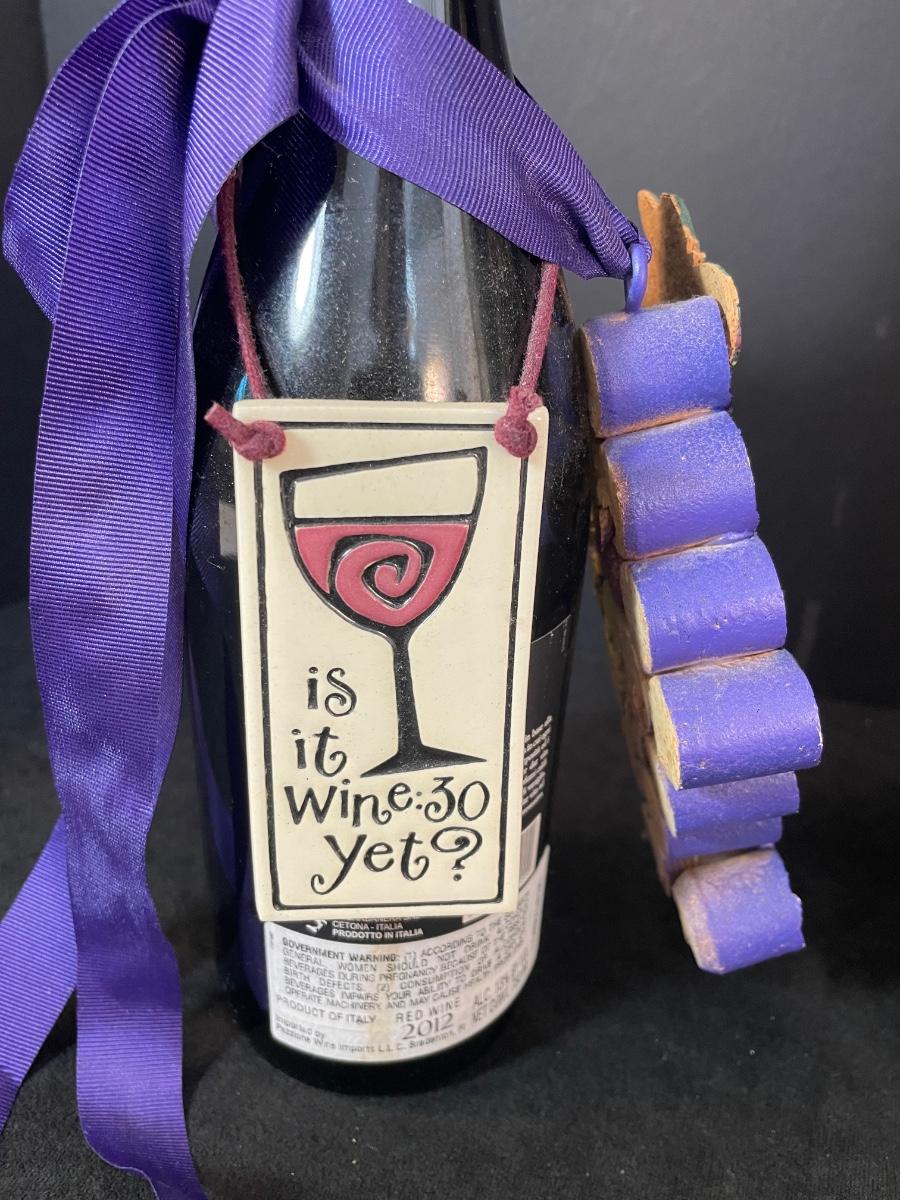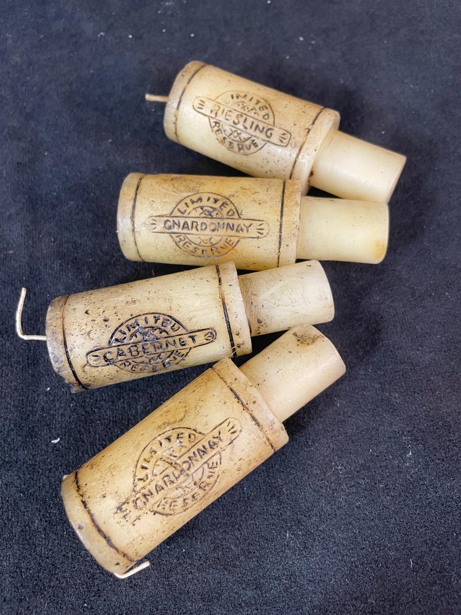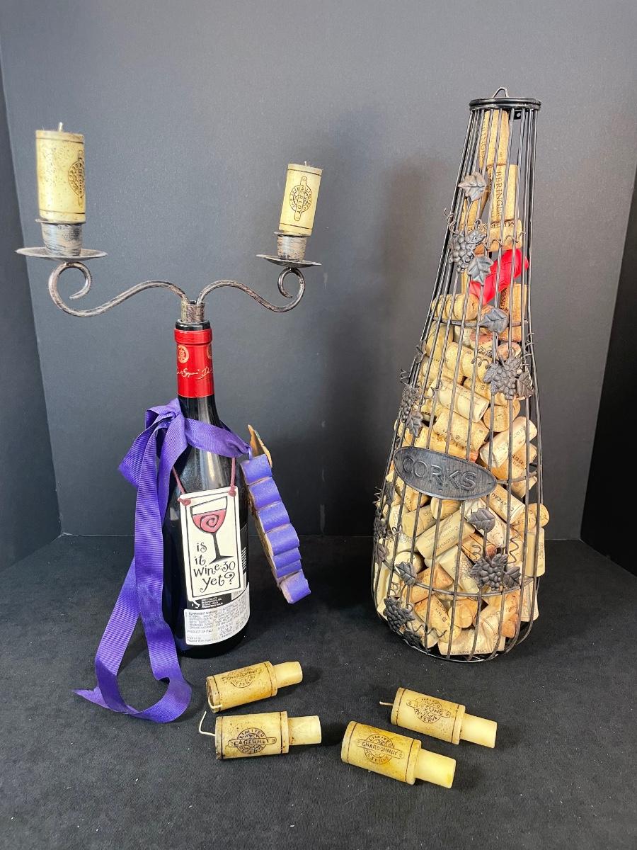 Metal basket full of wine corks, a candle holder and candles that a turn a wine bottle into a candelabra.