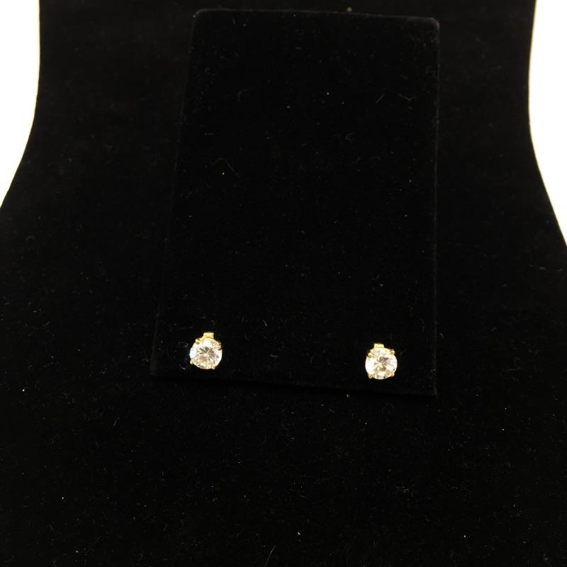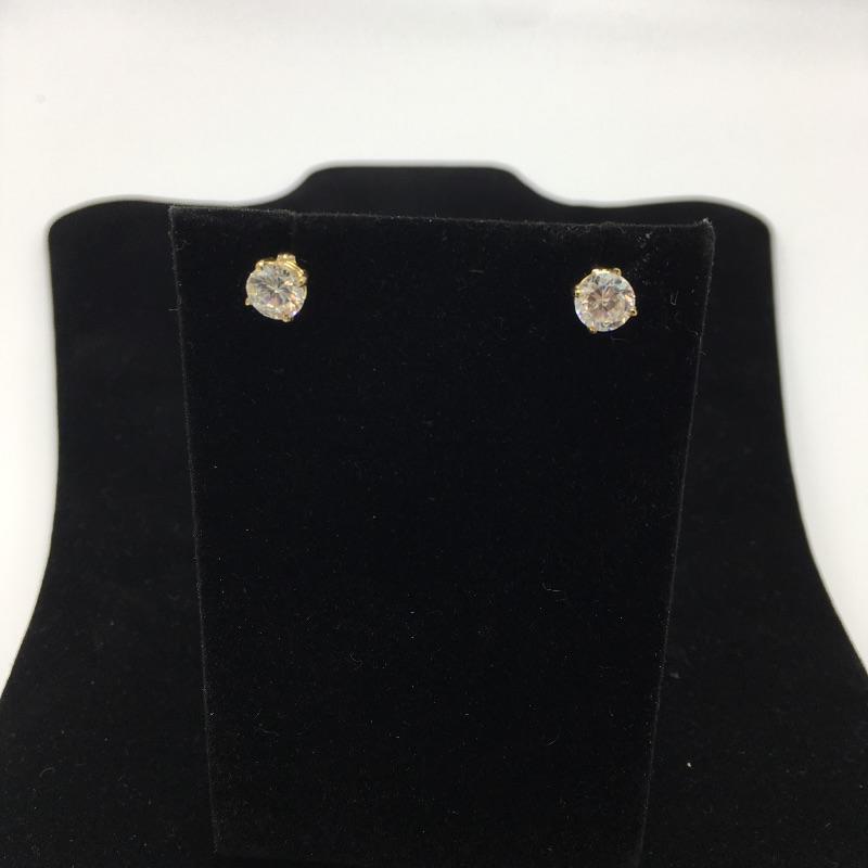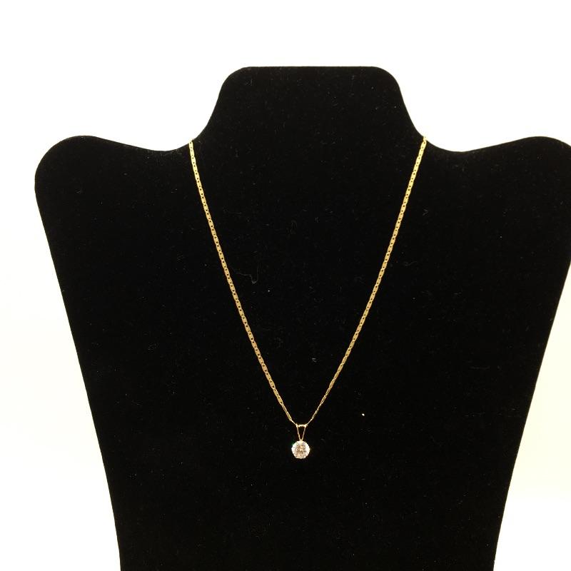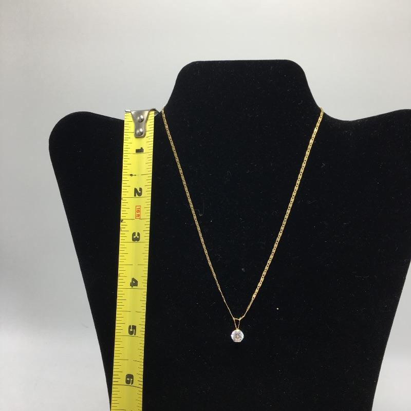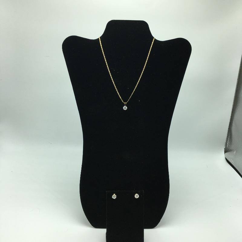14k gold necklace that measures 13” long with a cubic zirconia pendant and a pair of cubic zirconia stud earrings.