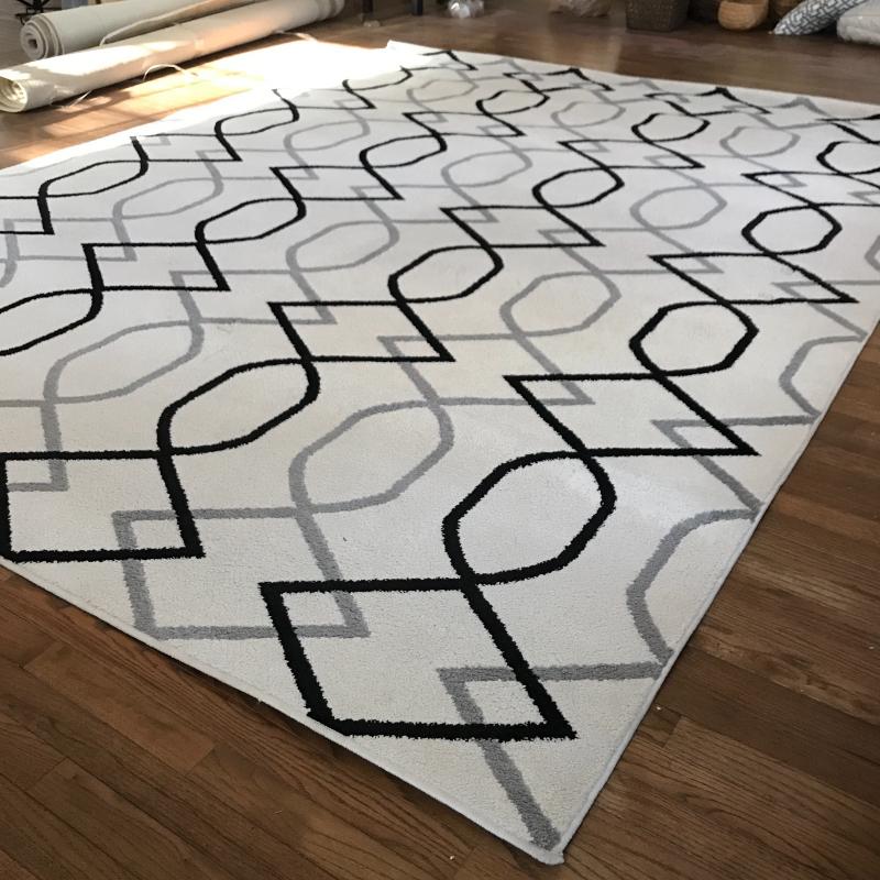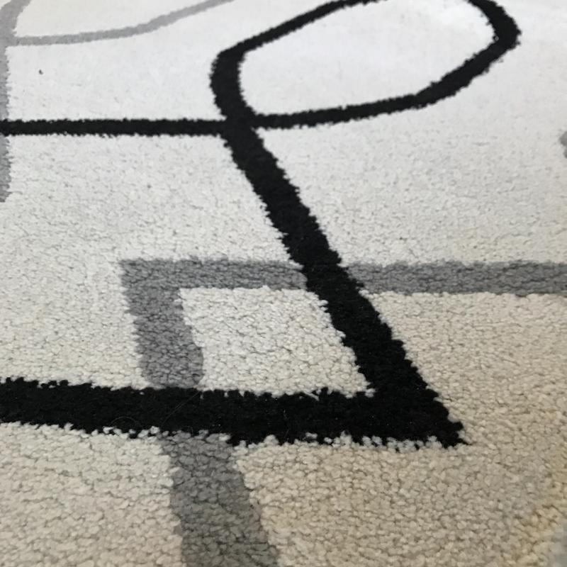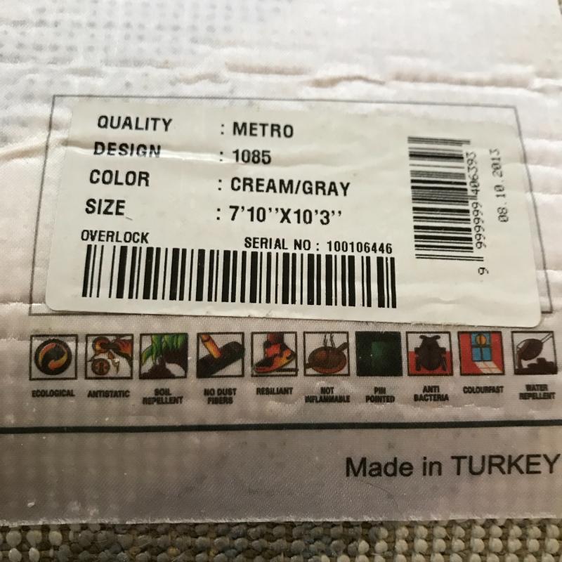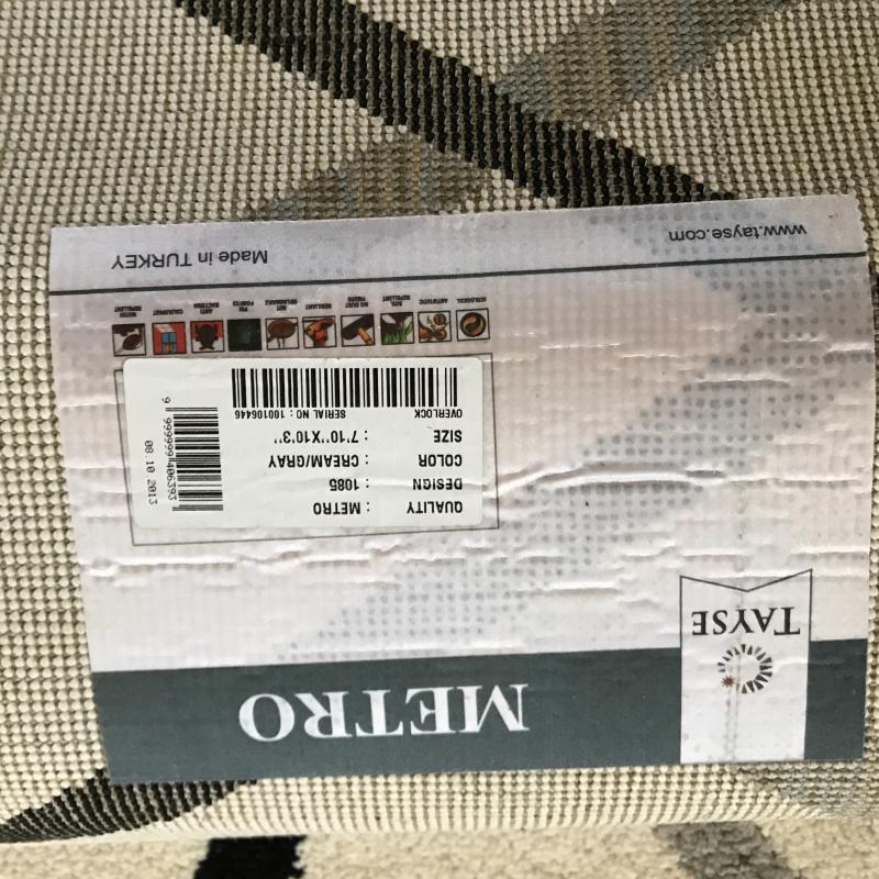 Metro rug is 7’ 10” x 10’ 3”. Grey, cream and black modern design. Some small indentions from furniture that should come out over time. Great condition. No shipping. Local pick up only in Flat Rock, NC.
