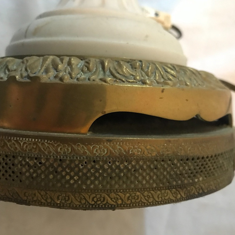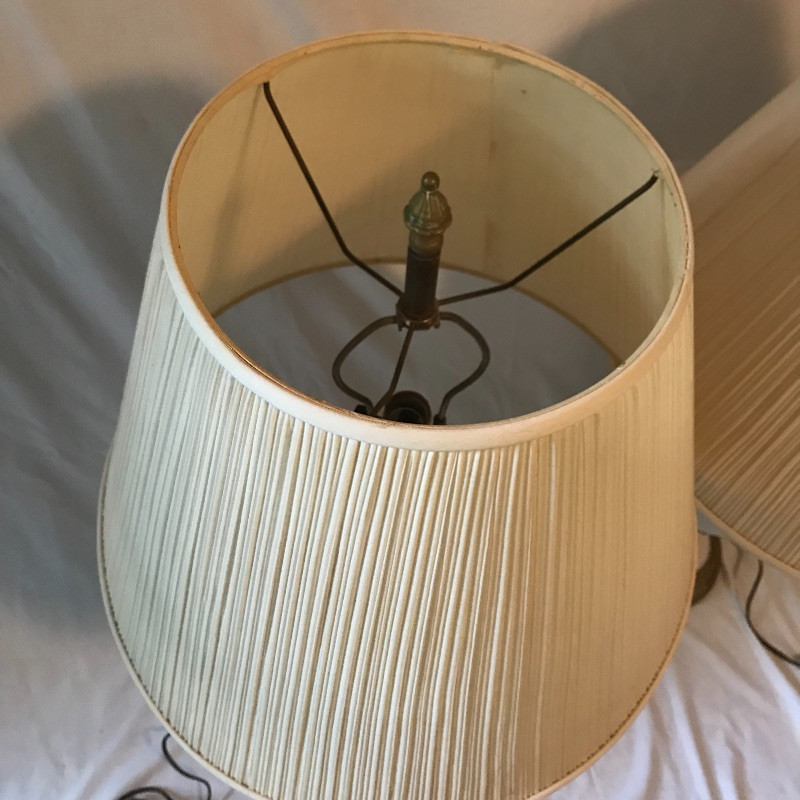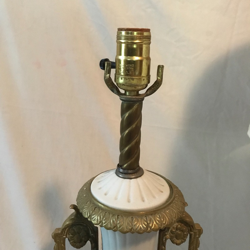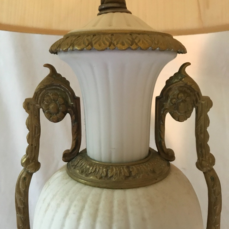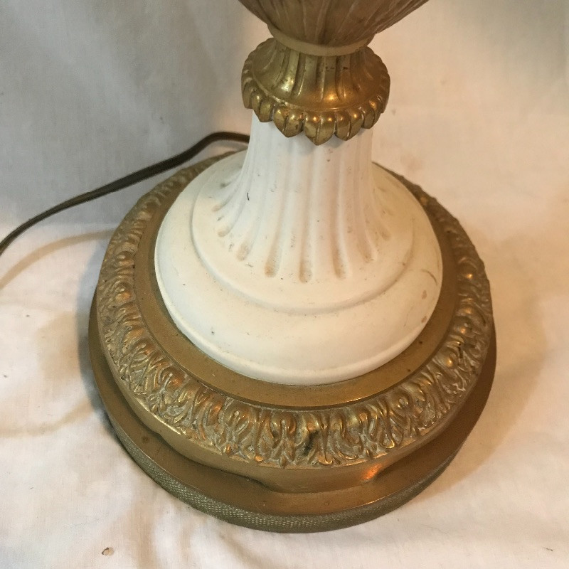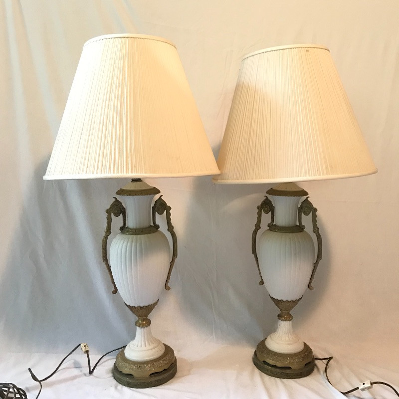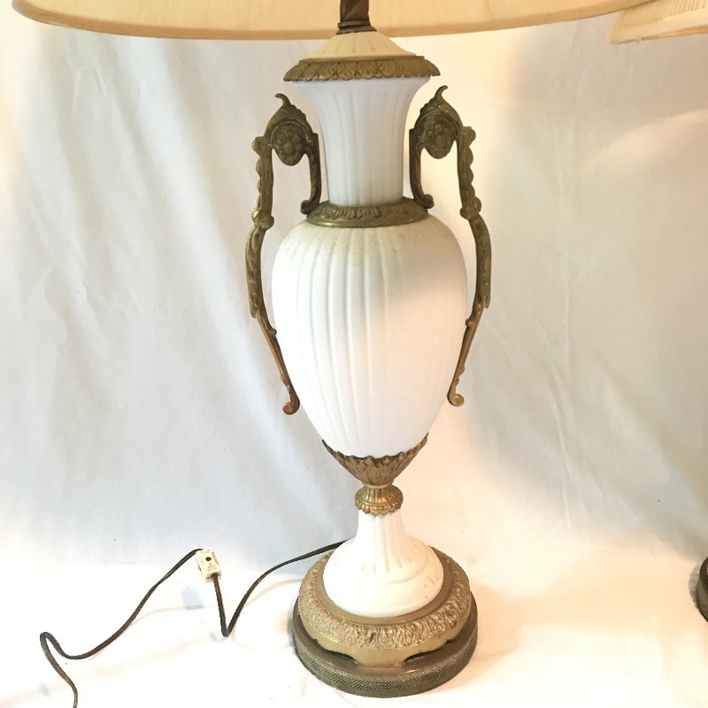 Two lovely brass adorned Grecian urn style lamps. Both have switched on the electric cord and turn on when plugged in. The body of the urn appears to be a matte ivory ceramic. Both lamps are substantial in weight and design. They have a 7” base diameter and the socket sits 27” high. See photos. Local pick up only.