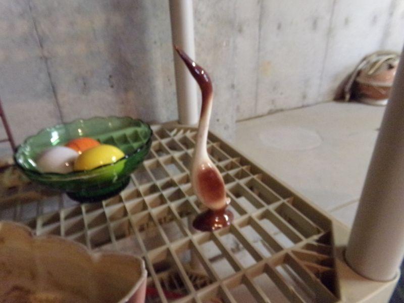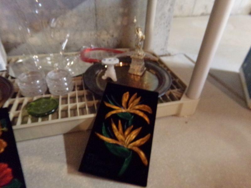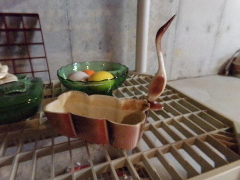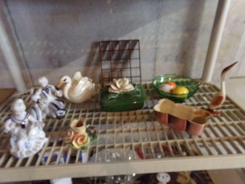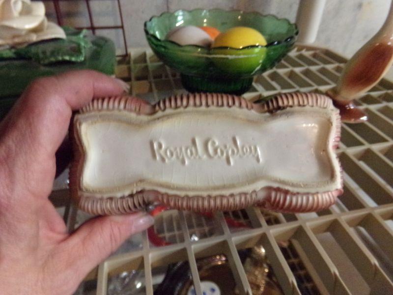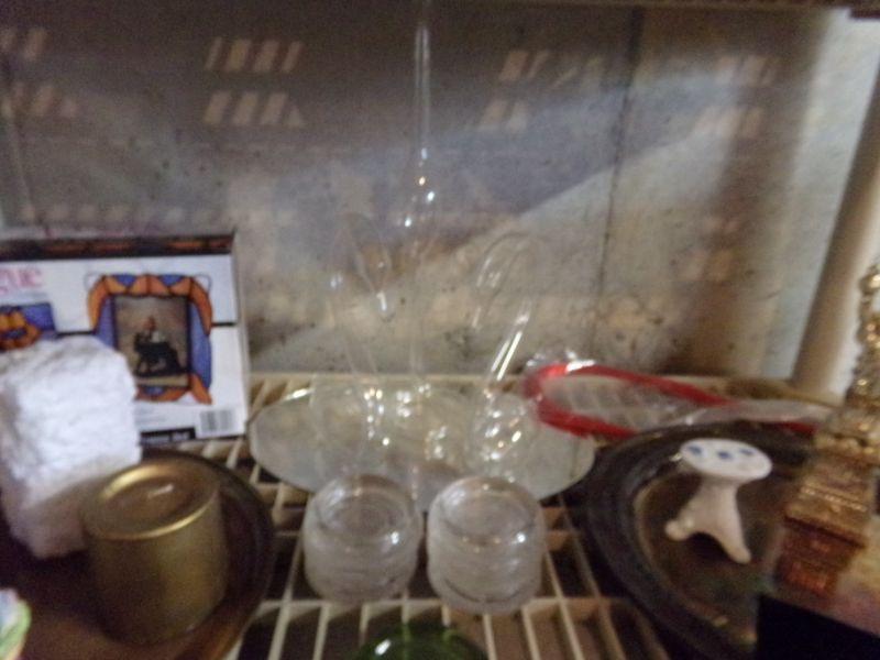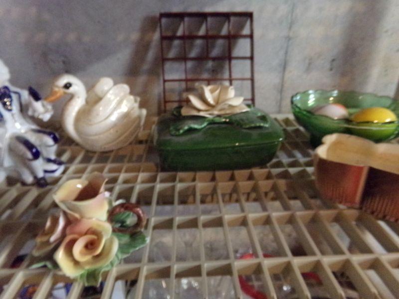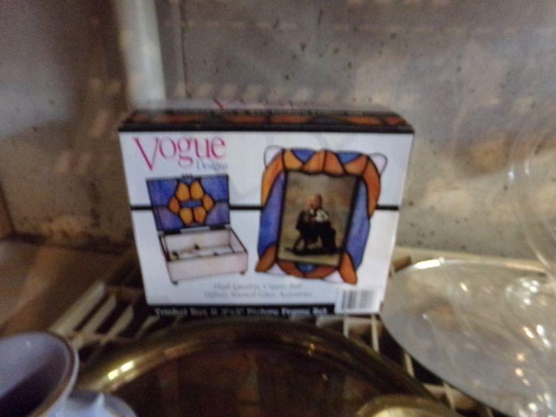 ROYAL COPLEY (CHIPPED), STAINED GLASS TRINKET BOX (NIB), GREEN GLASS DISH, MARBLE EGGS, CANDLES, AND MORE