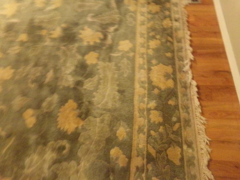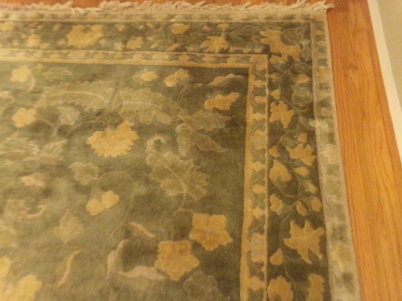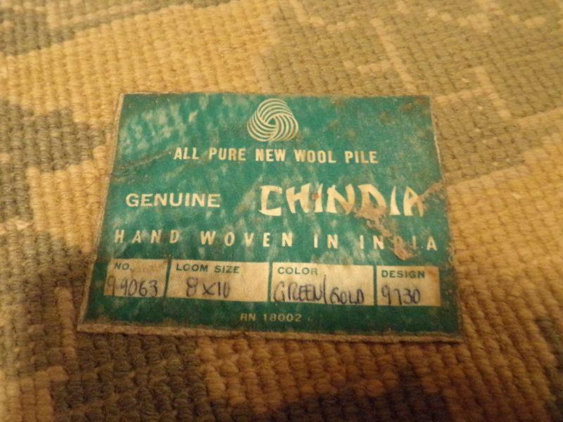 8ft x 10ft GENUINE CHINDIA RUG. GREEN/GOLD ALL PURE NEW WOOL PILE. HAND WOVEN IN INDIA. IT IS IN FAIR CONDITION