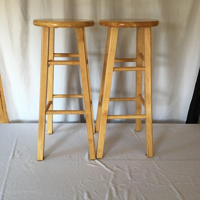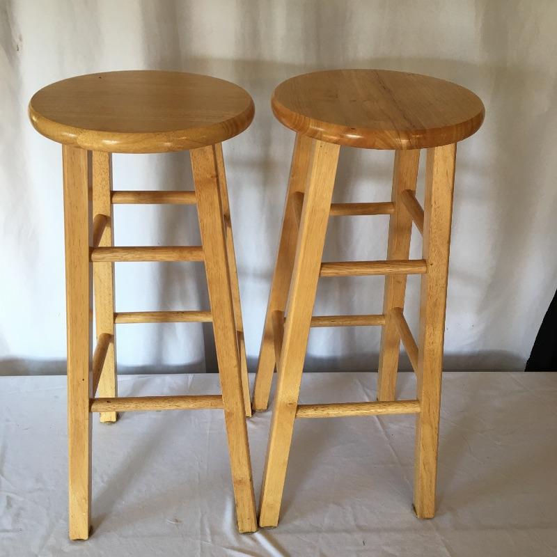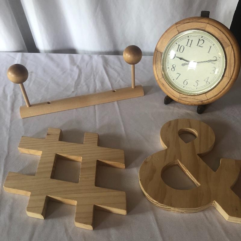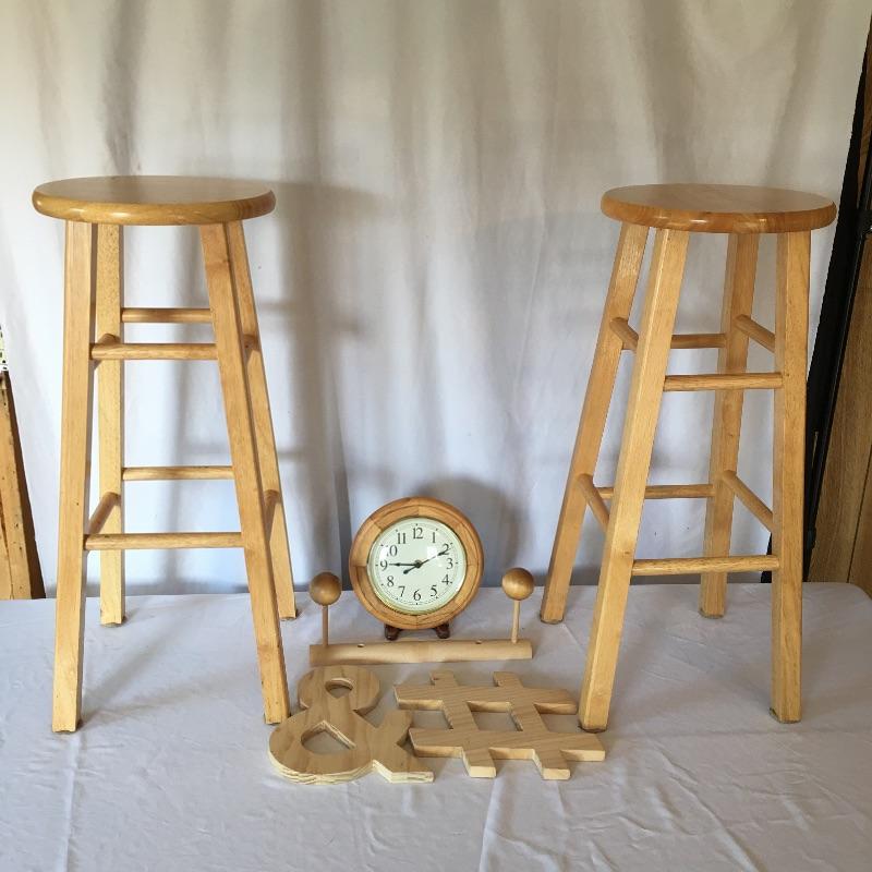 This pair of wooden stools will be great for your bar or kitchen. Lot also includes clock, ampersand, hashtag and wall mount hat rack. Clock was not tested as it has no battery. Stools measure 12.5” x 12.5” x 29”.
