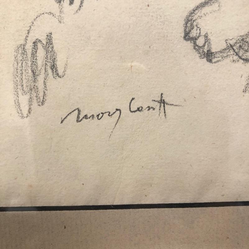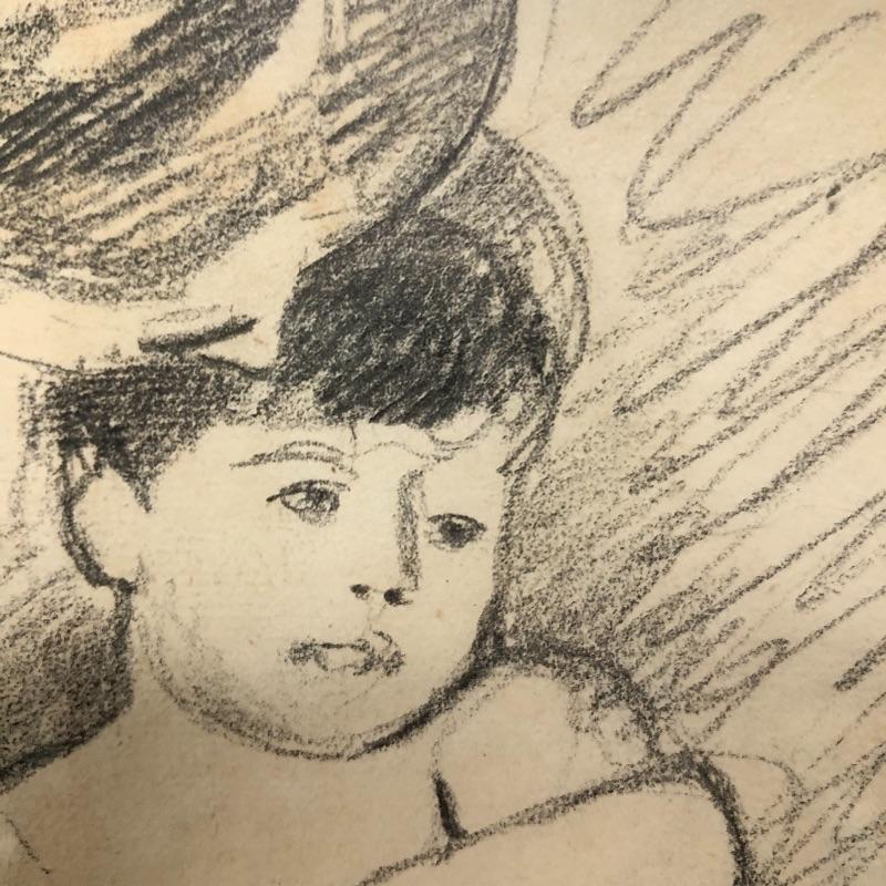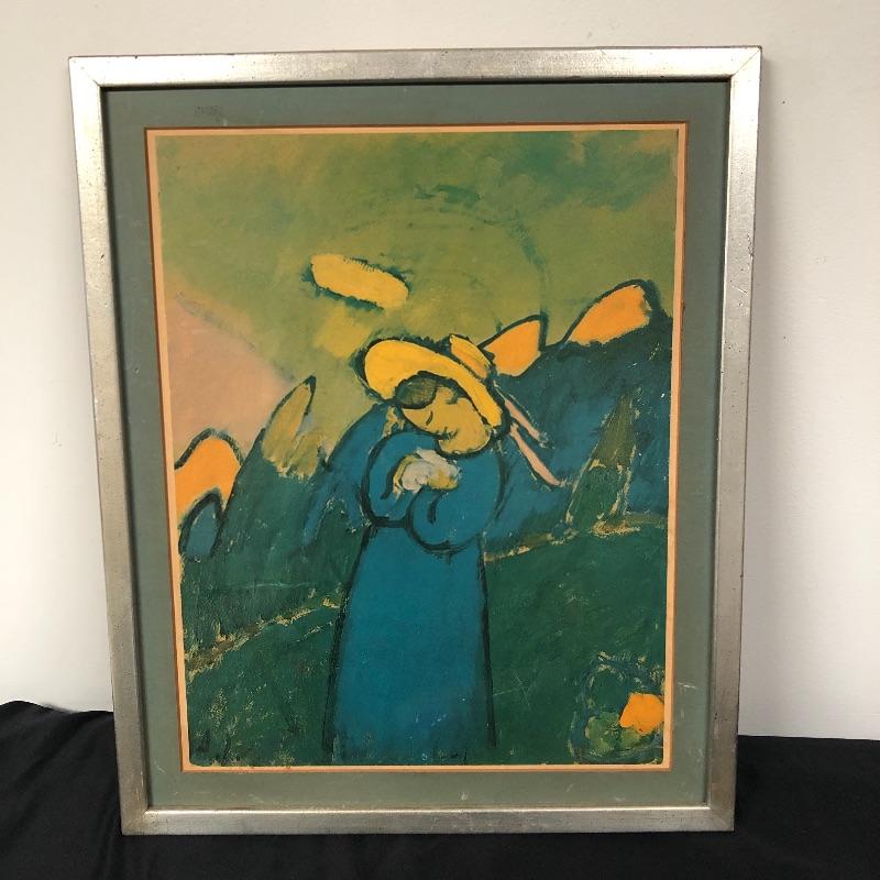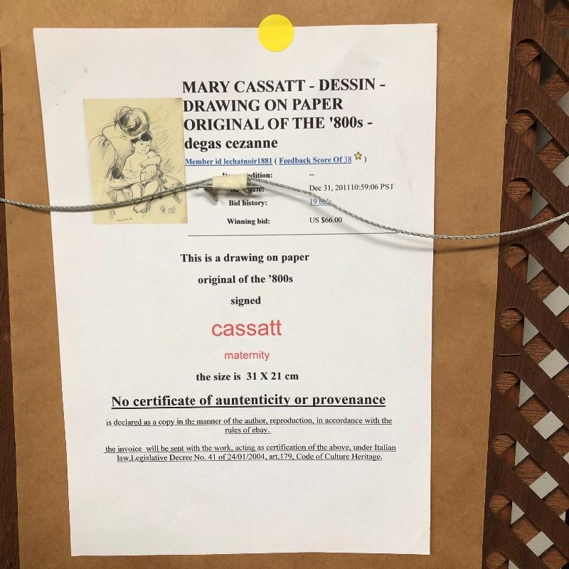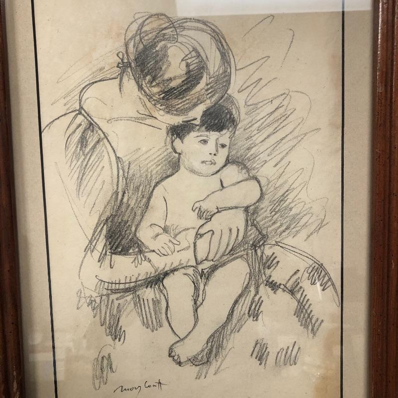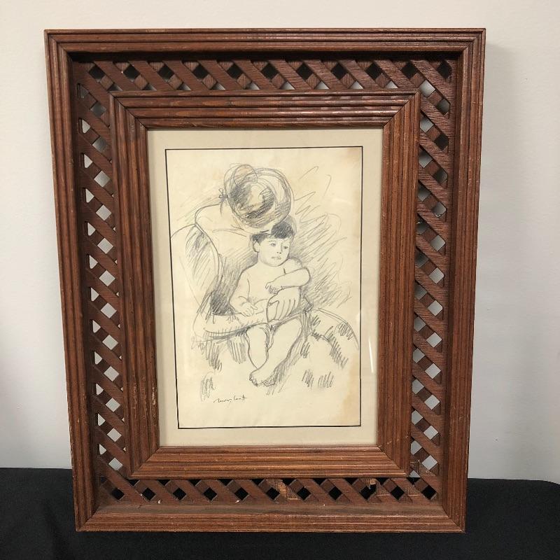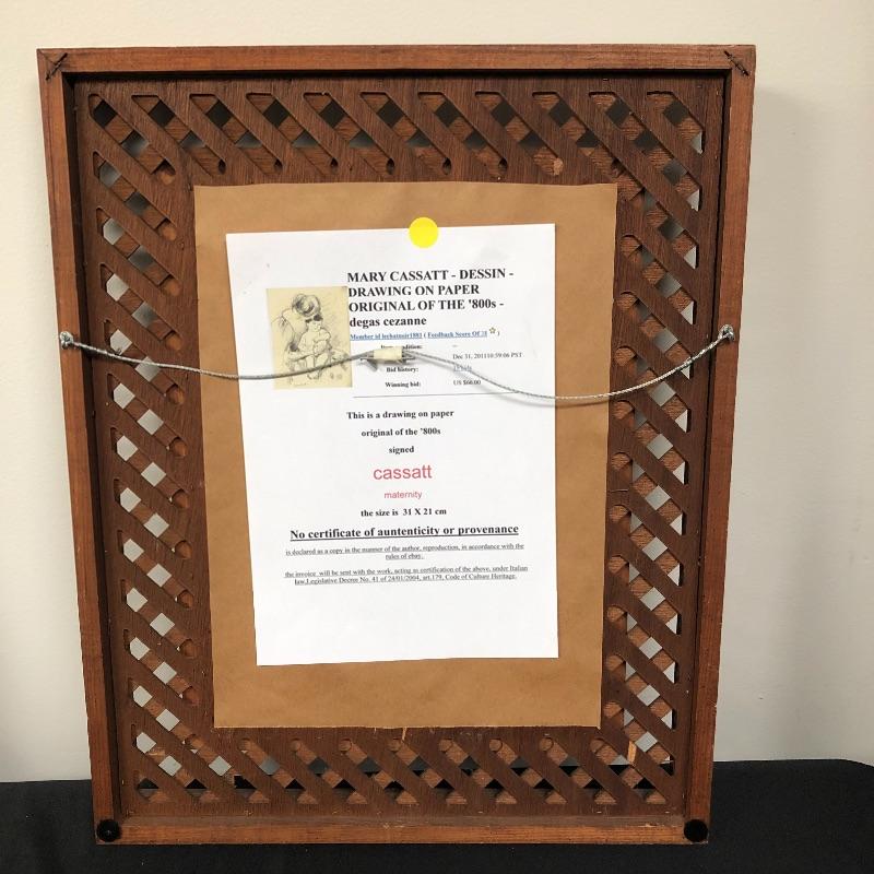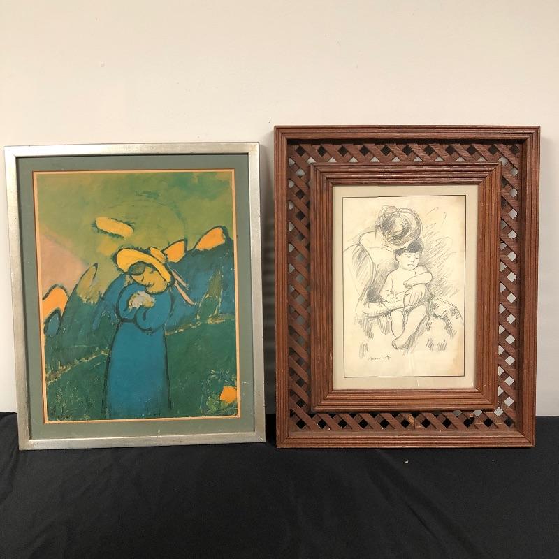 This lot includes two beautiful pictures. The first (21” x 31”) is a pencil drawing in the style of Mary Cassatt. It is framed in intricate wood frame with glass front. There is paperwork attached to the back with info on the drawing. The second (16.5” x 20”) is a colorful print on a hard board that is framed with no glass protection. There are a few tears on the back paper and writing in pen.