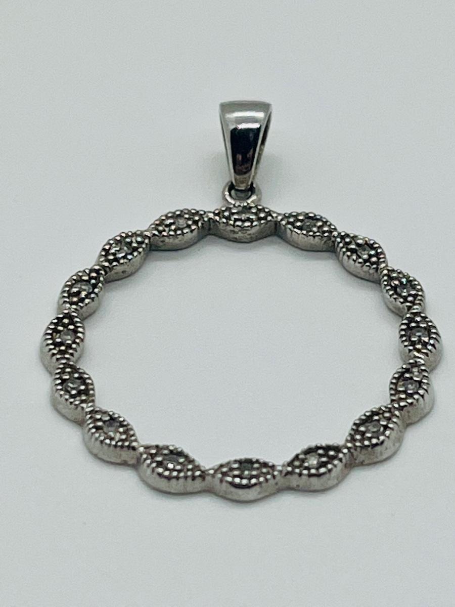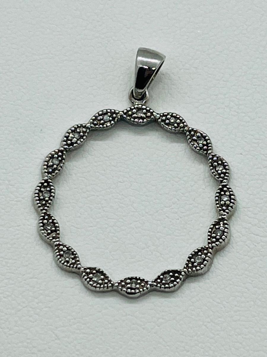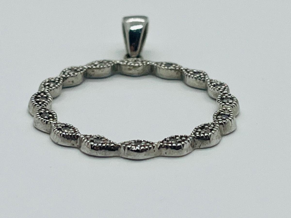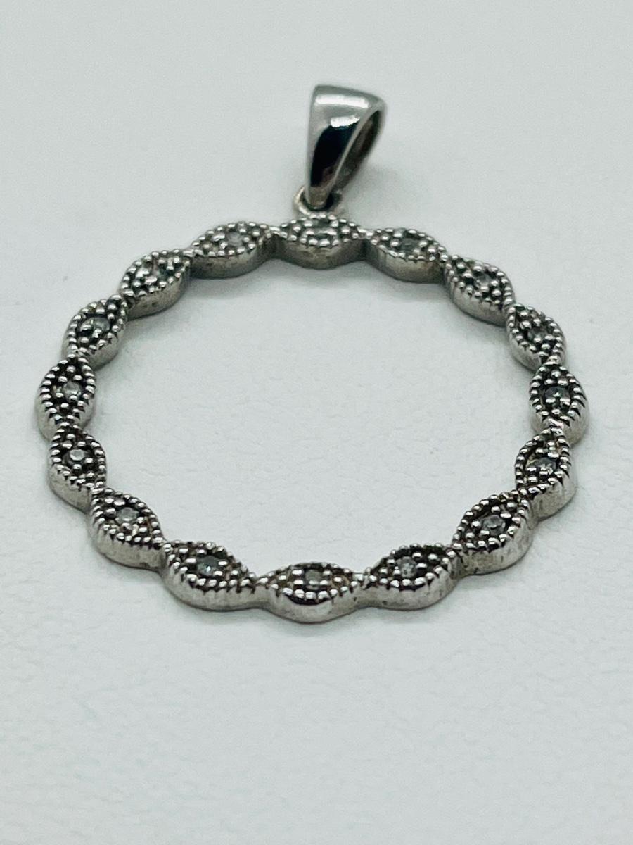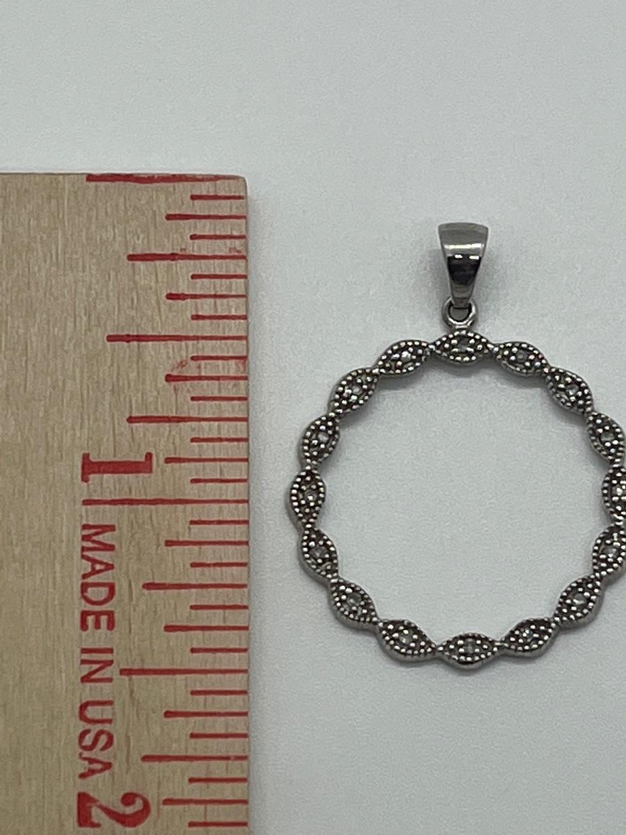 16 diamond chips set into sterling circle bail marked 925.The pictures show condition, measurements if taken, and what is included in the lot. Due to the large amount that we photograph and the time frame, we are not always able to take measurements. All items unless noted, are pre-owned and have been used, and are untested. Thank you