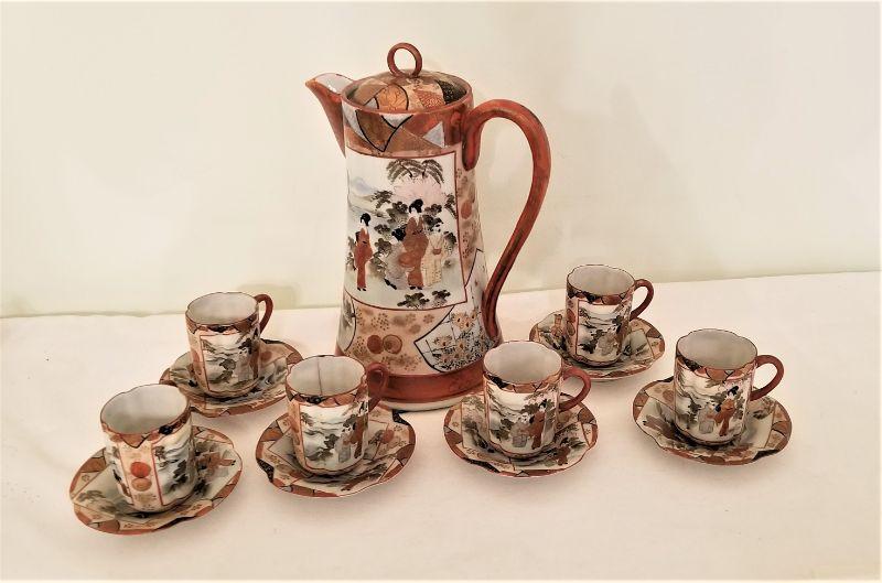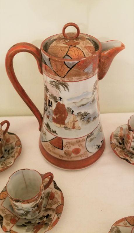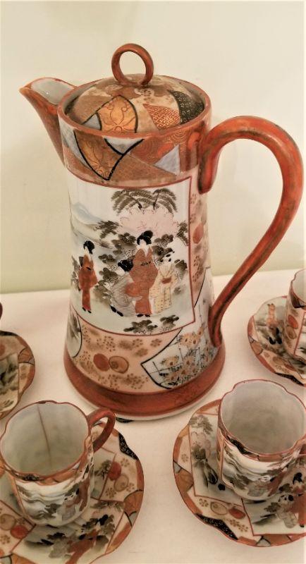 You get all you see here - antique Chinese teapot and 6 cups/saucers. Good antique condition. Probably early 20th century. Teapot is 10" tall, cups 3" tall - one cup has a hairline crack.