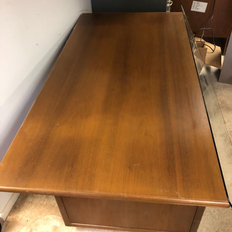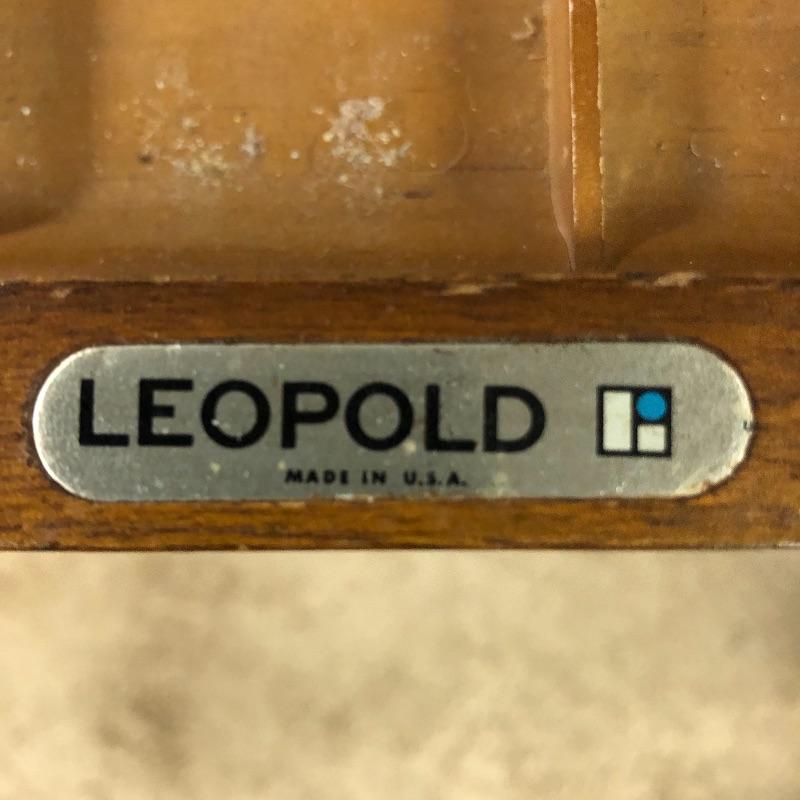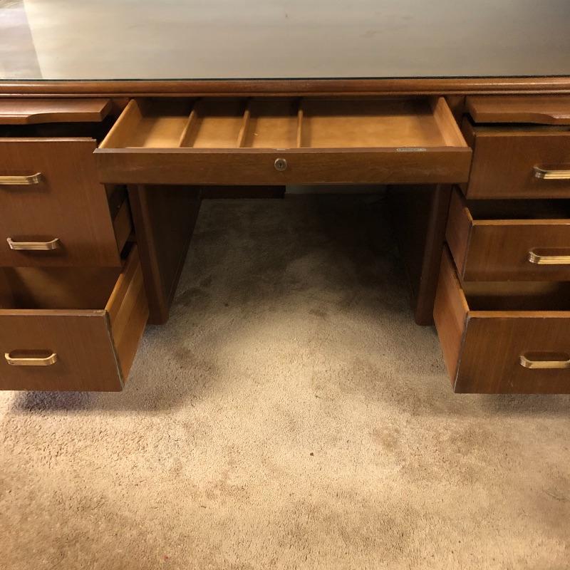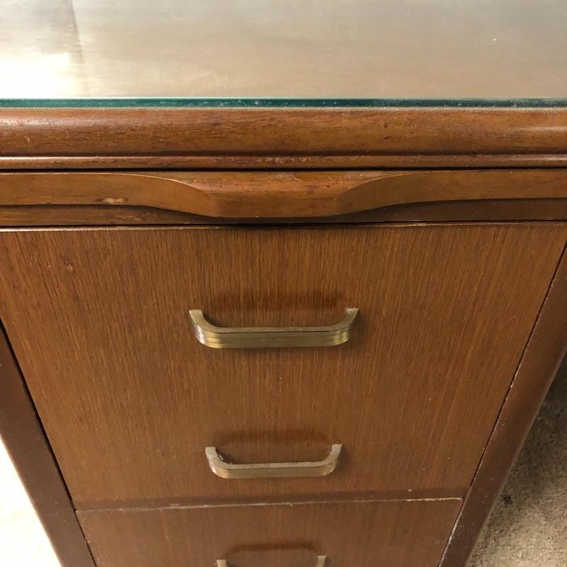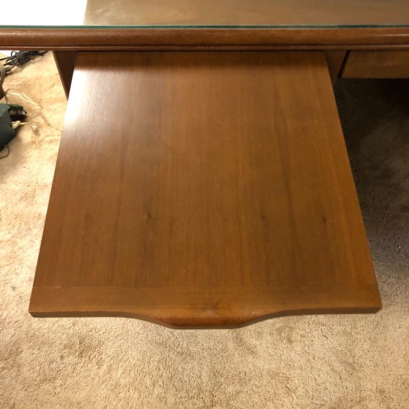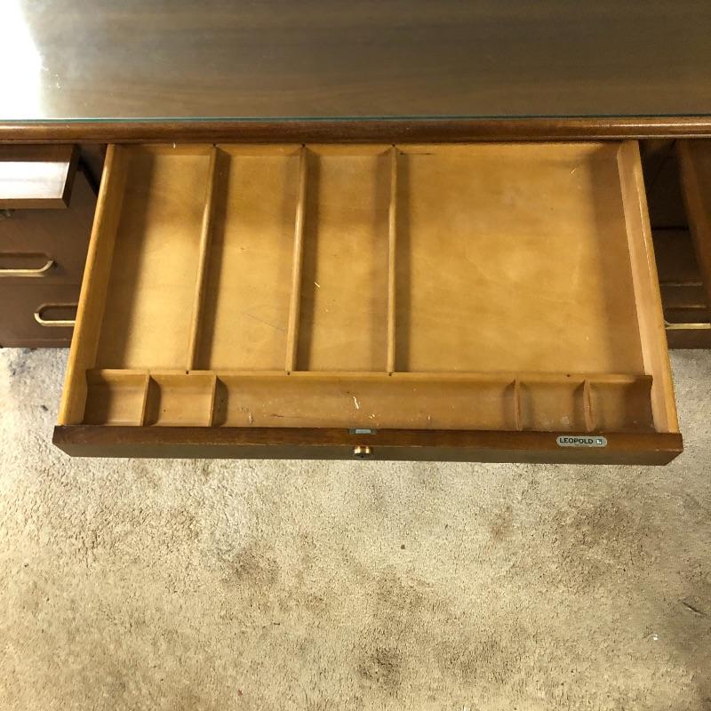 This very beautiful, very large vintage Leopold desk has all you could possibly need in a desk and more. Made by Leopold, world famous for quality construction and craftsmanship using a unique process called "densification" that resulted in this extremely sturdy, extremely strong piece. It is in excellent condition with a few scratches in the protective glass top that has done its job well and protected the wood. This desk has an additional section that could be added if the back of the desk was exposed for aesthetic purposes. See images for all the useful drawers, cabinets etc. Hardware pulls are brass, key is not included. The last 3 images show the extra back piece and a view of the pristine top of desk minus the glass protector.