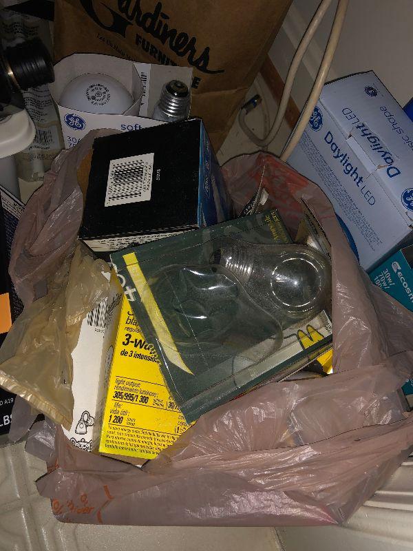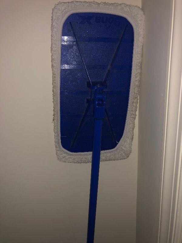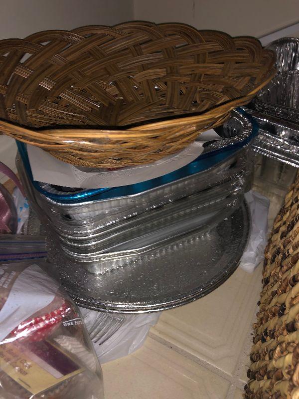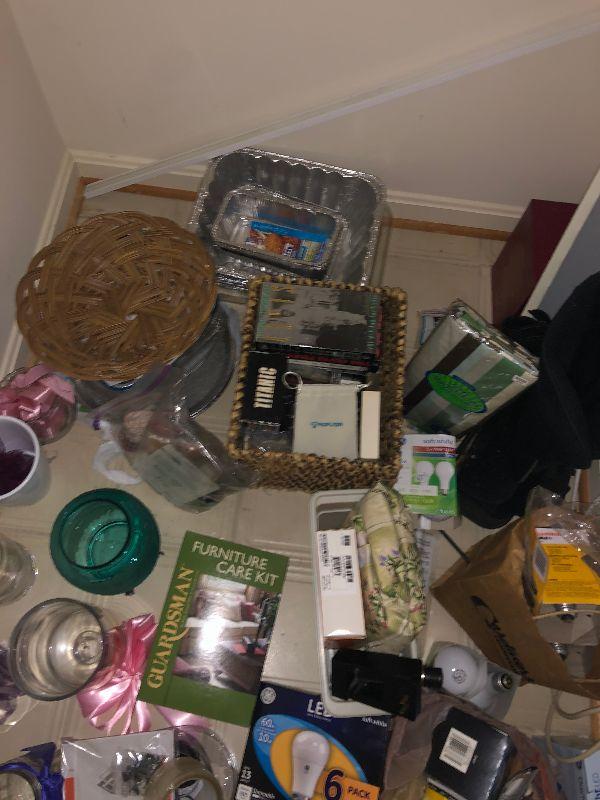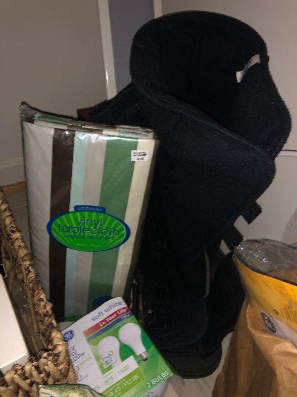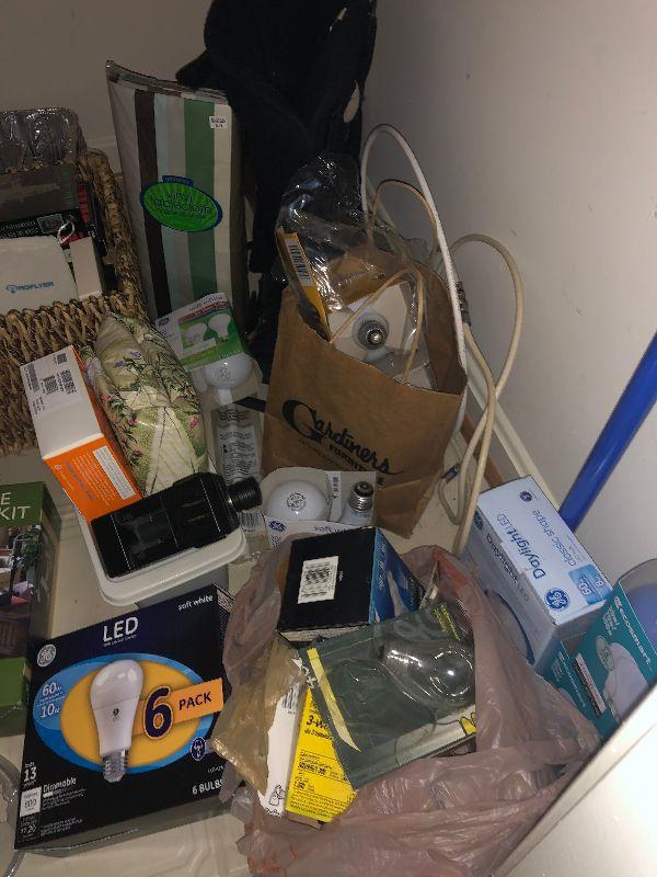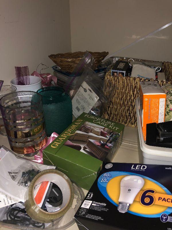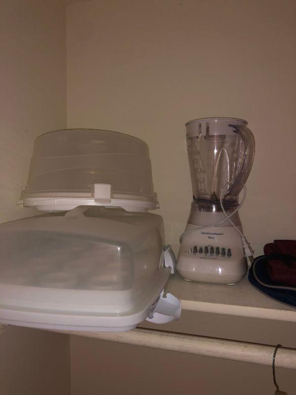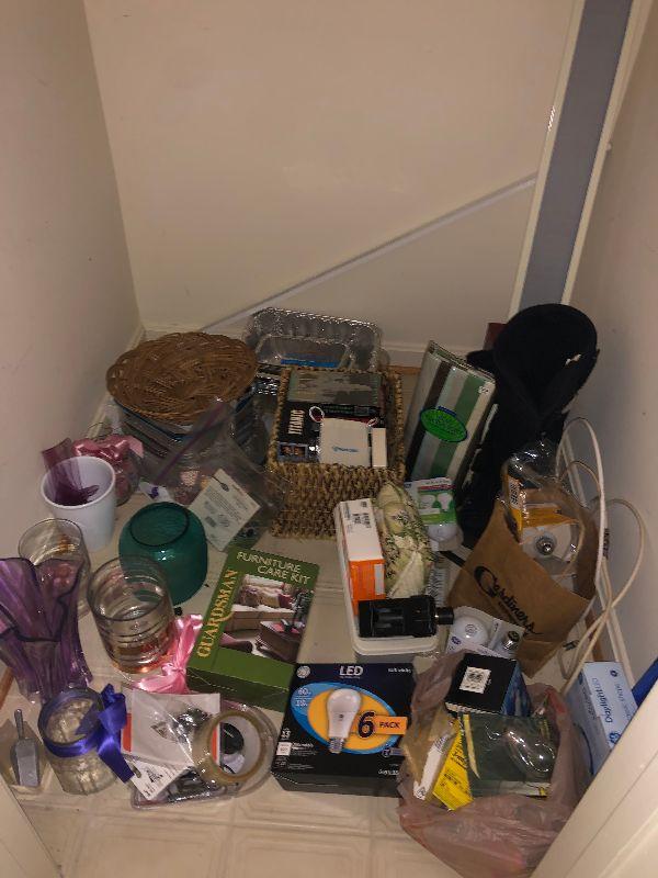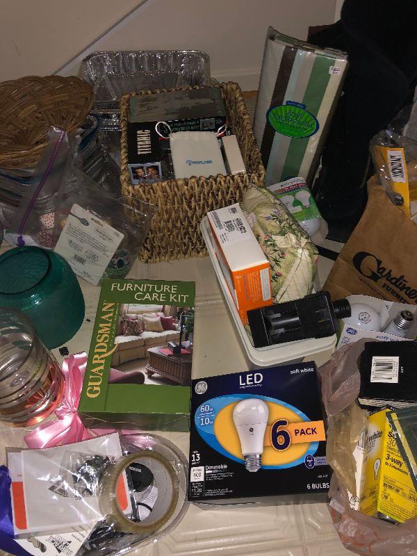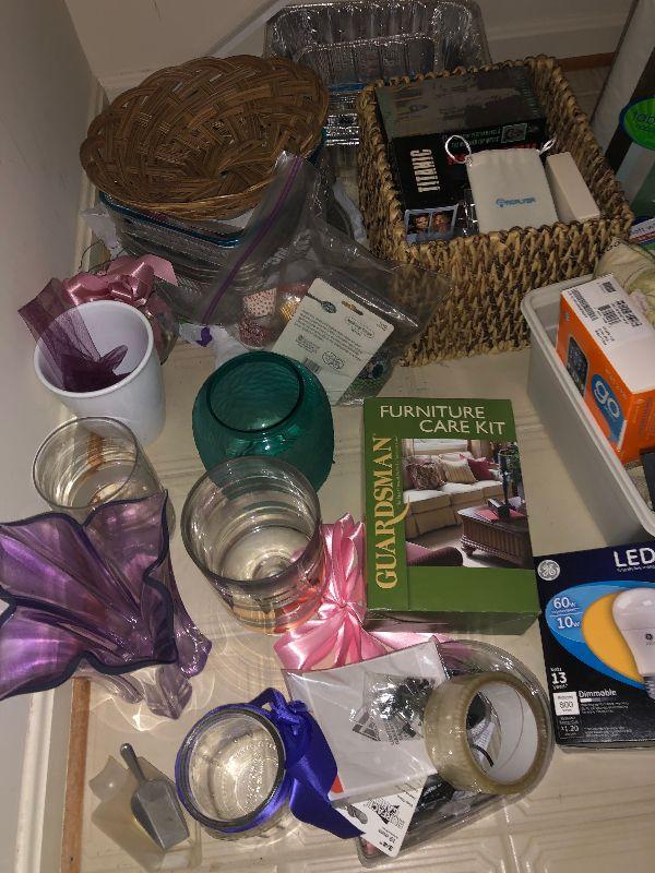 Assortment of Miscellaneous Items including a Blender, Cake Traveler, Light Bulbs, Foil Pans, Floor Duster, Vases, Round Vinyl Table Cloths for Umbrella Table and More.