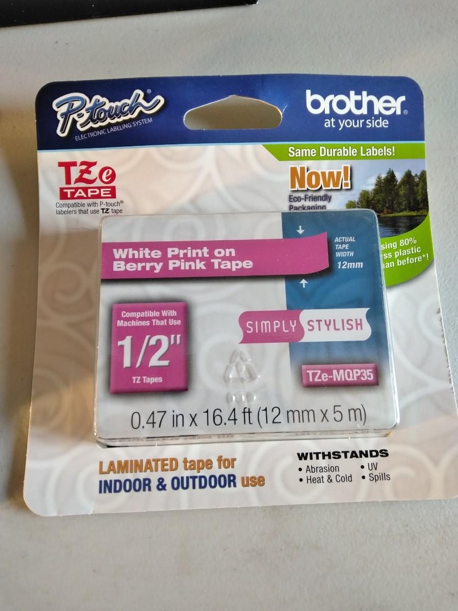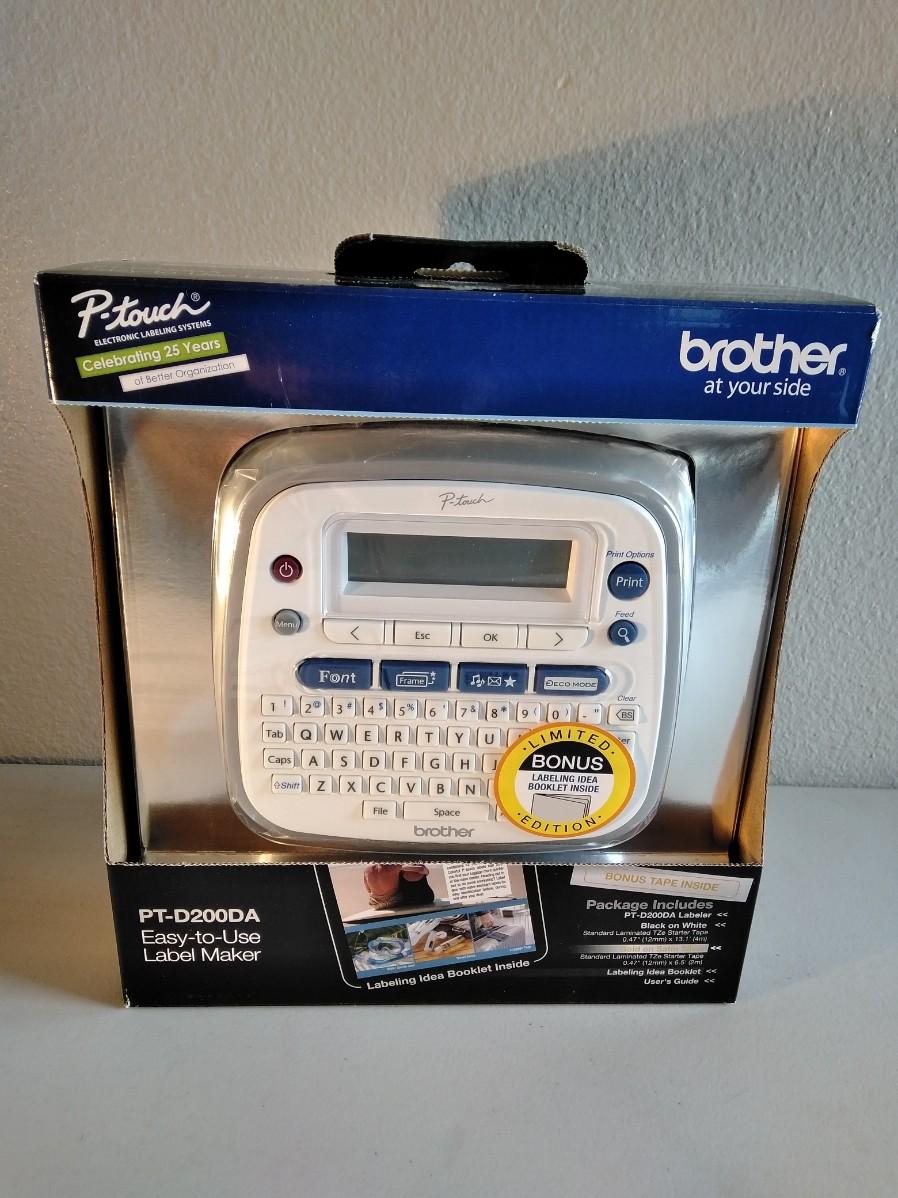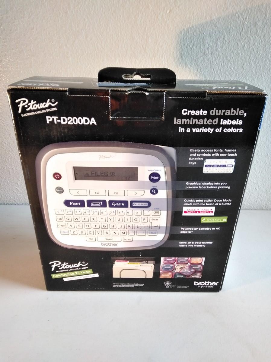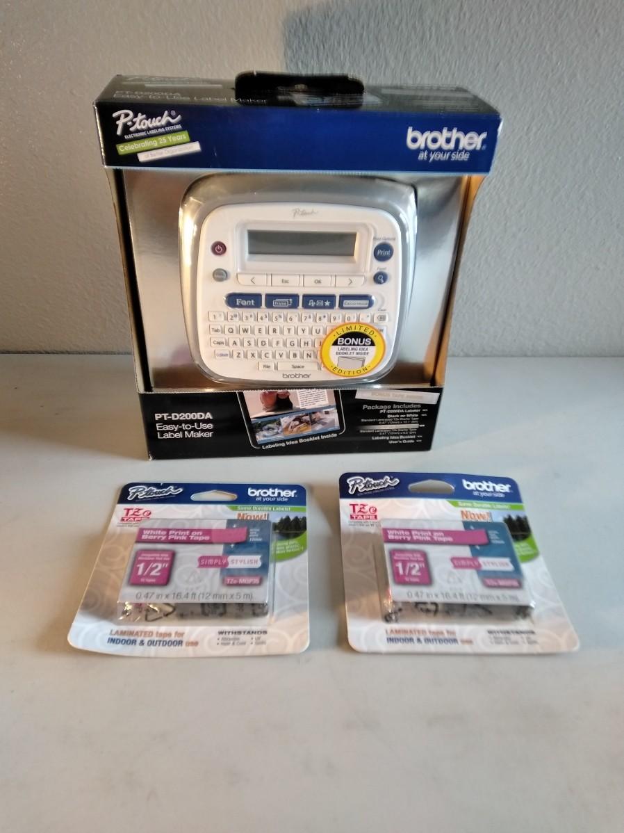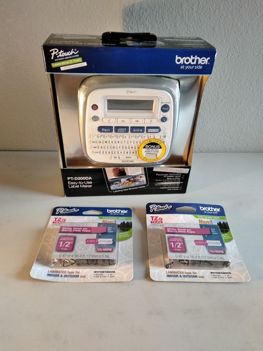 P -TOUCH BROTHER LABEL MAKER MODEL PT-D200DA CREATE DURABLE LAMINATED LABLES IN A VARIETY OF COLORS. COMES WITH TWO WHITE PRINT ON BERRY PINK TAPE PACKAGES.