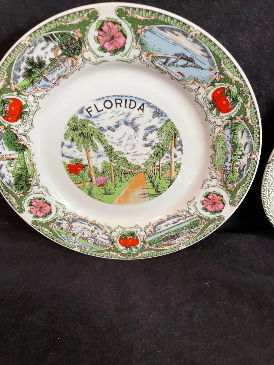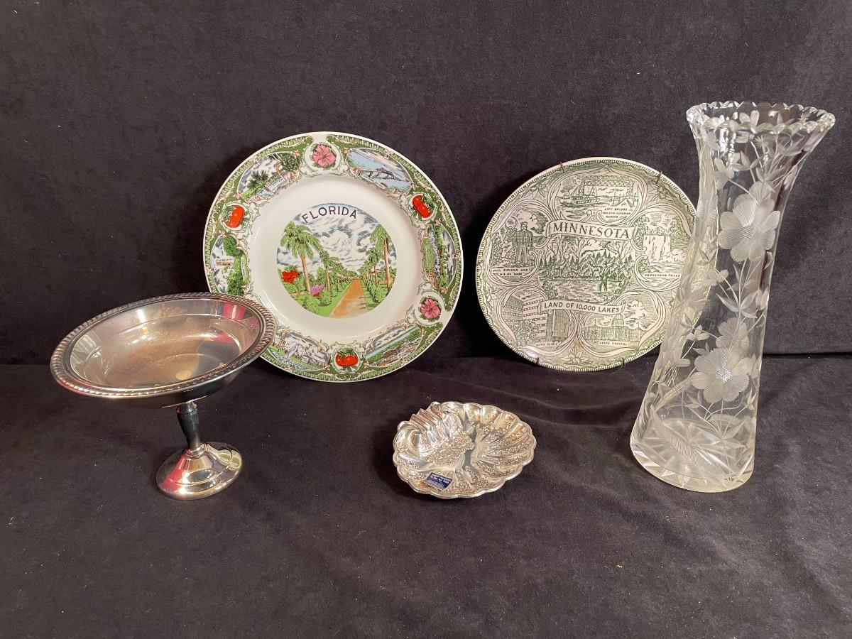 Commemorative plates from Florida and Minnesota, etched crystal vase, silver-plate trinket dish and sterling silver footed compote dish