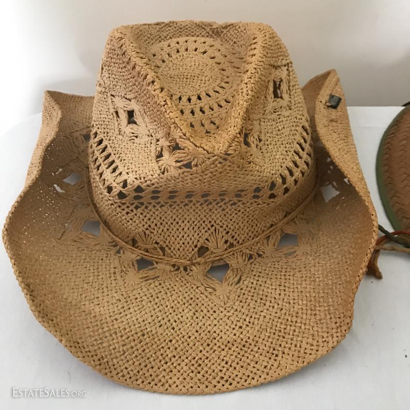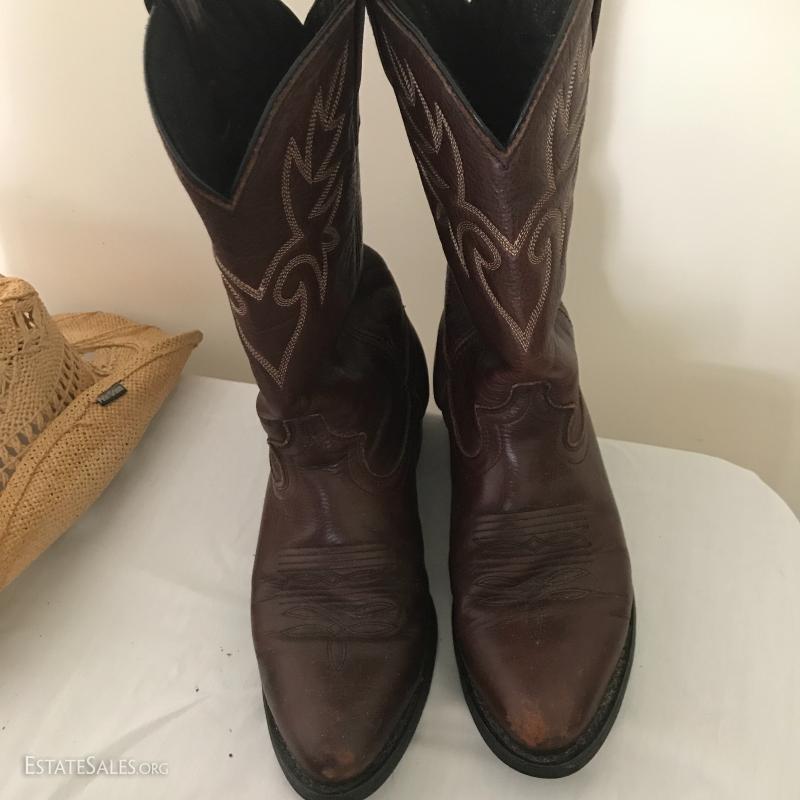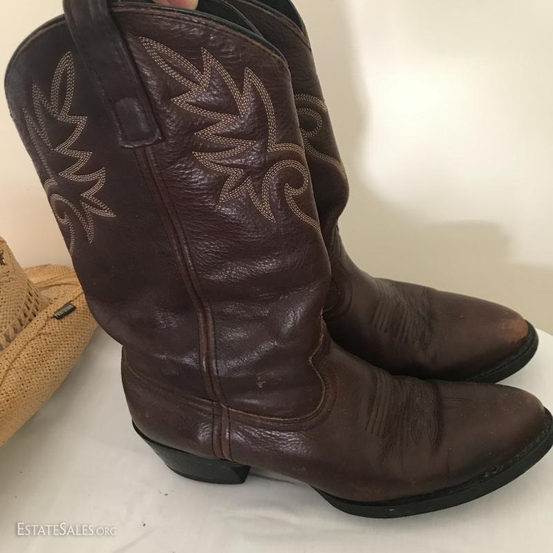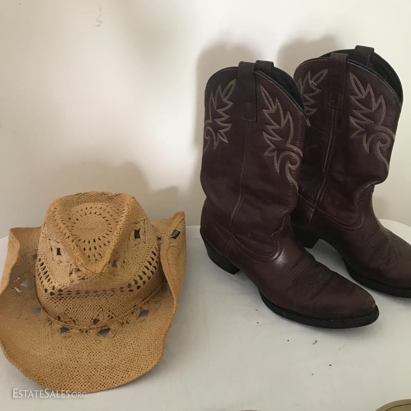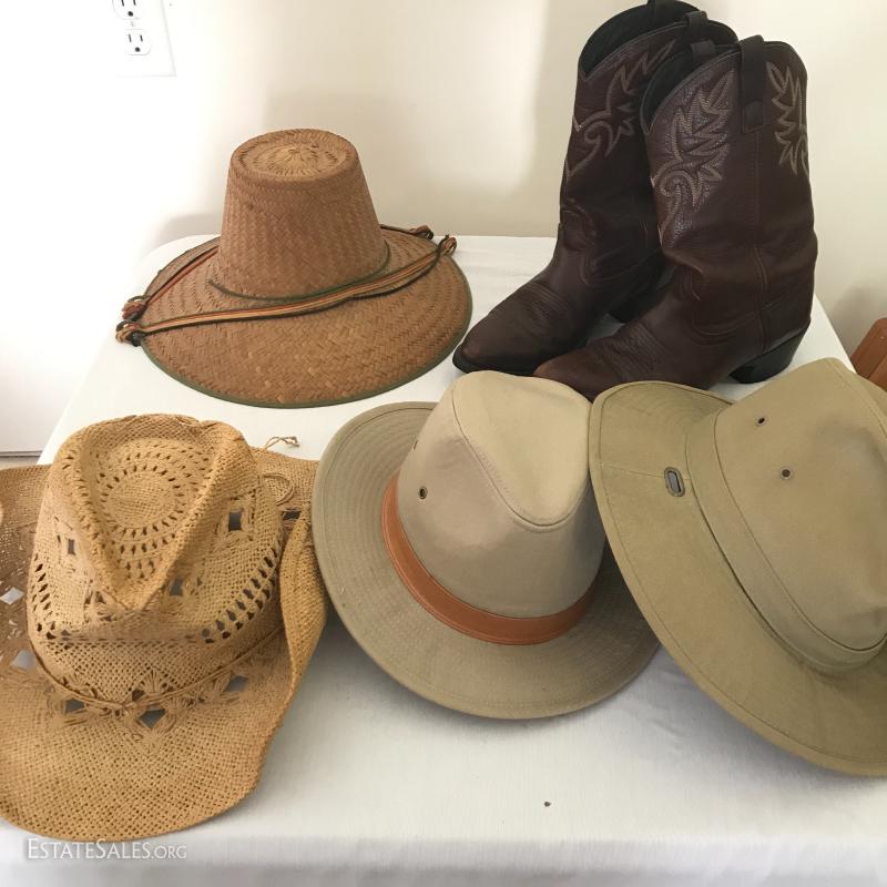 Dingo cowboy boots, nicely worn in. Reddish brown leather color. Four hats include two straw (one Peter Grimm) and two canvas (one JHats size M). See pictures. Shipping or Local pick up in Mills River, NC.