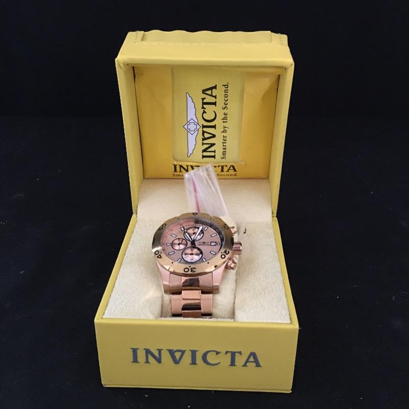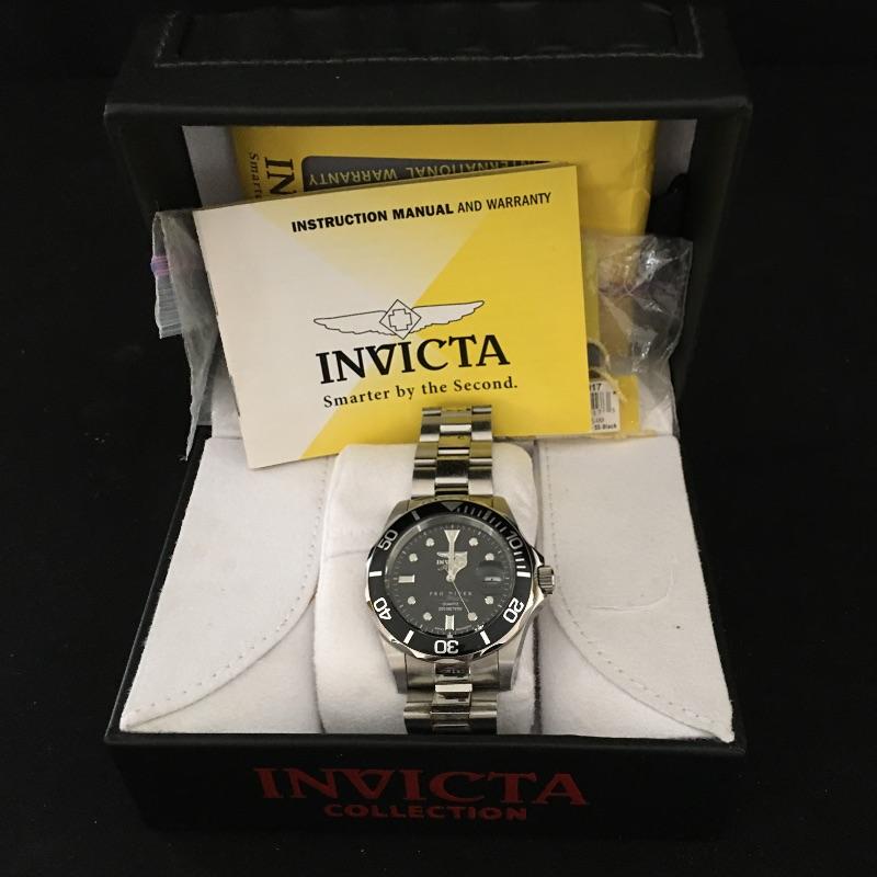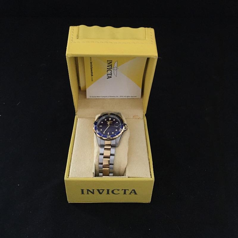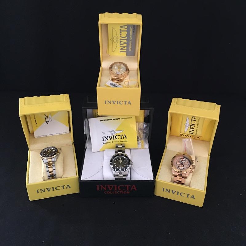Lot includes four Invicta watches with boxes. Watches look excellent and lightly used as well as boxes. All watches were not tested as they appear to need batteries. Look sharp with these great looking watches.