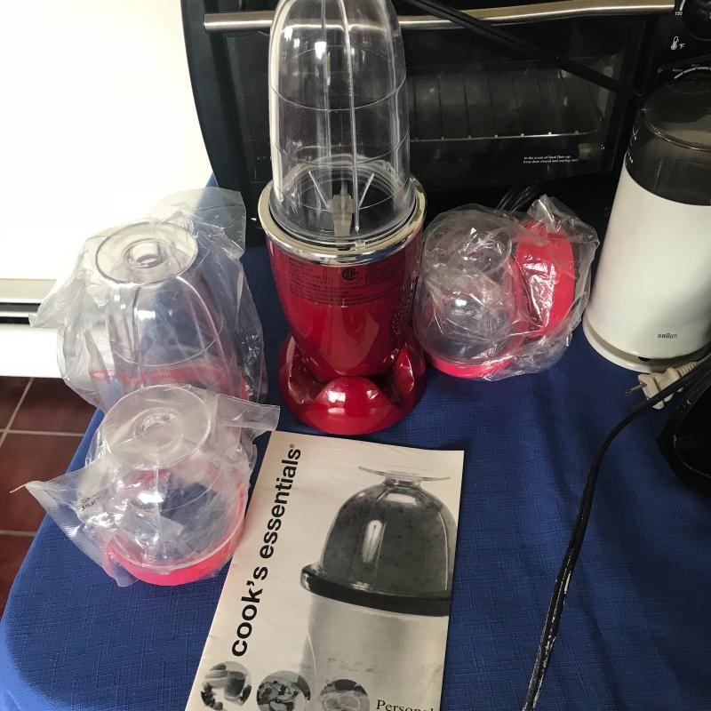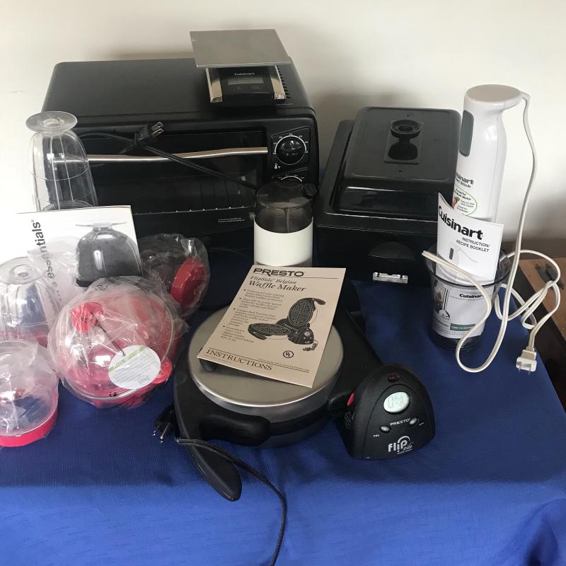 Braun coffee grinder, presto waffle maker, cuisanart hand blender, egg cooker and personal blender by Cooks Essentials, Euro-Pro toaster over and cooker. Local pick up only.