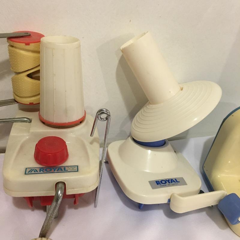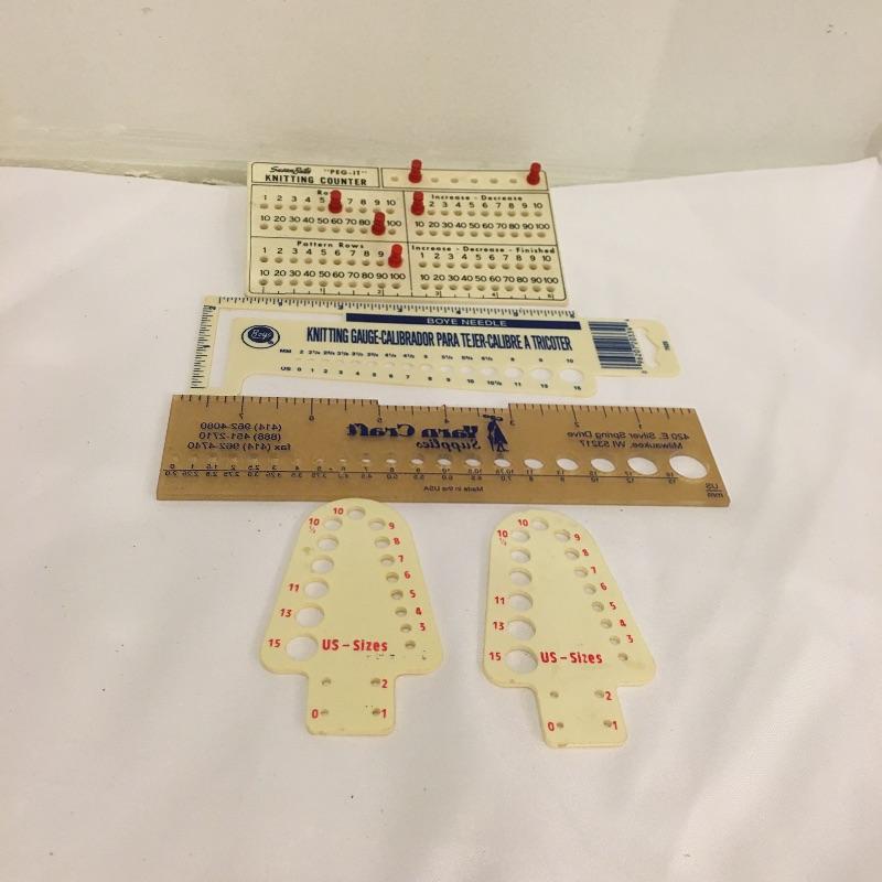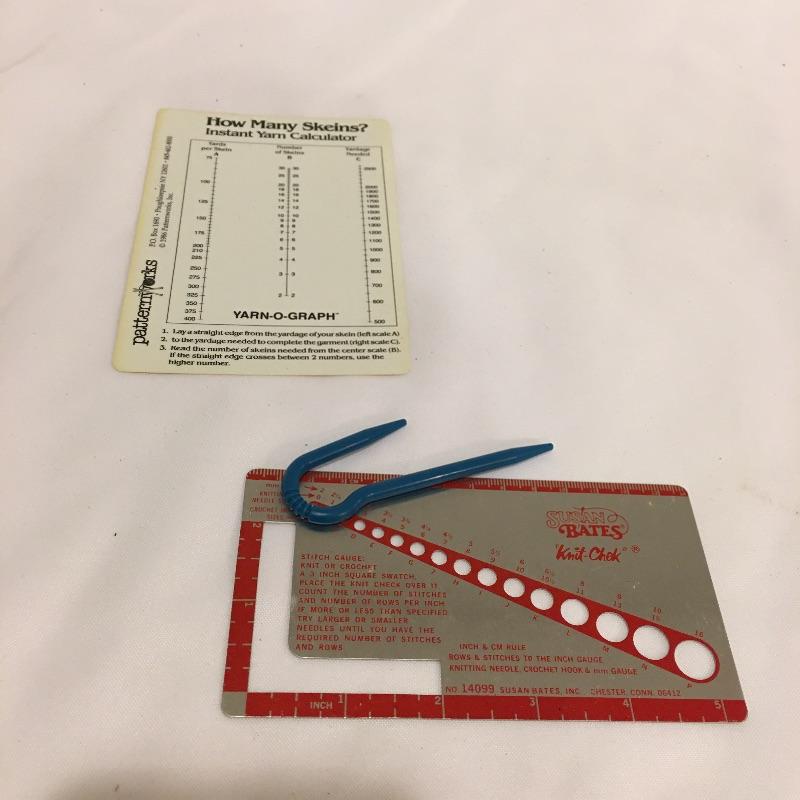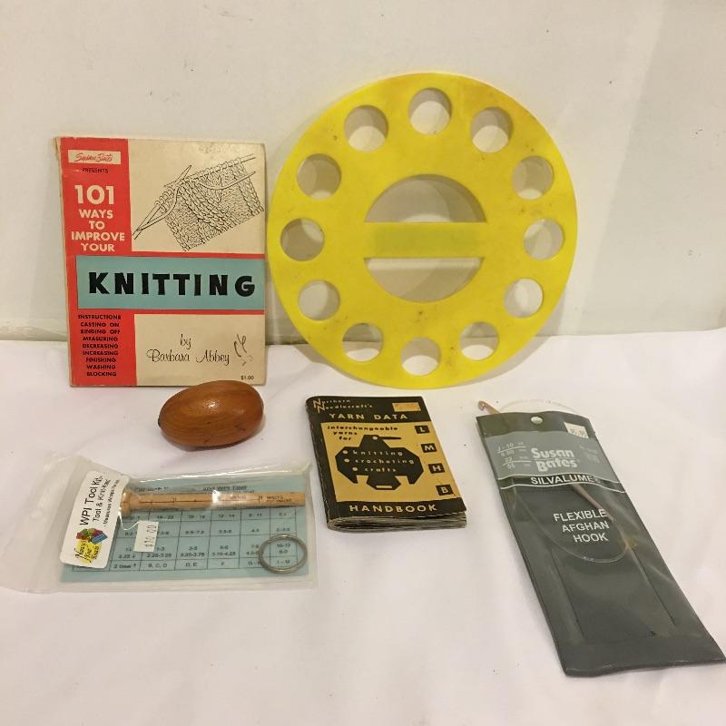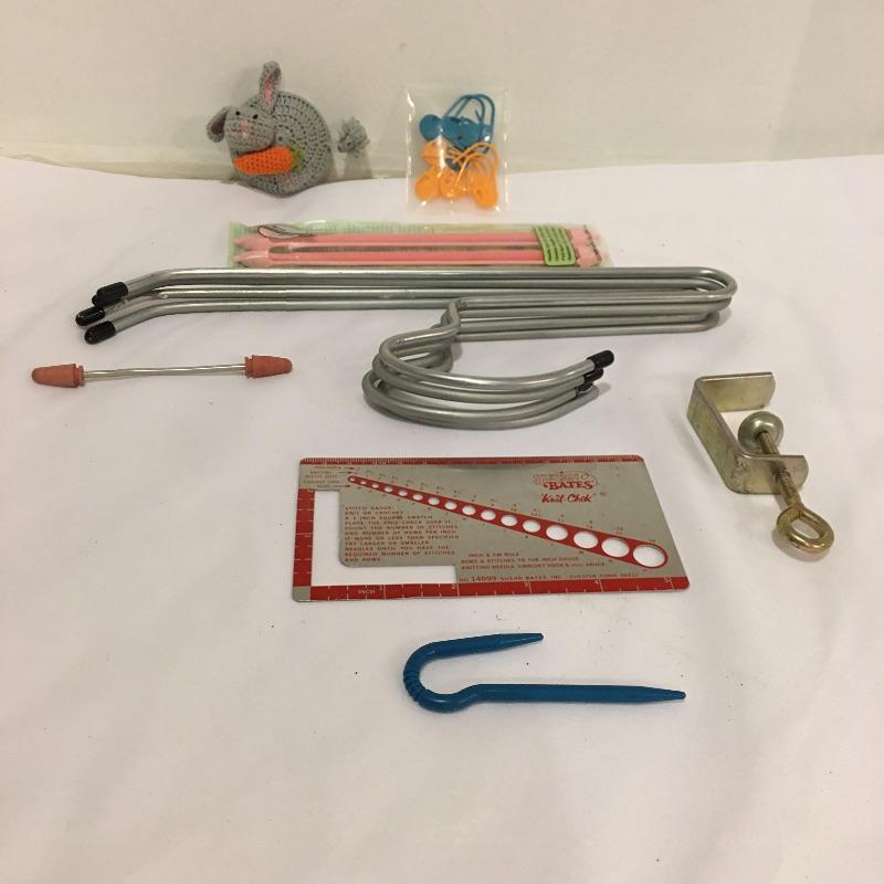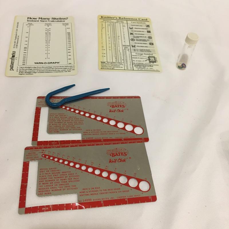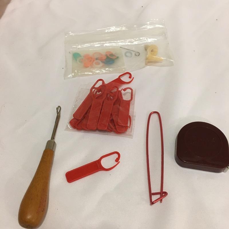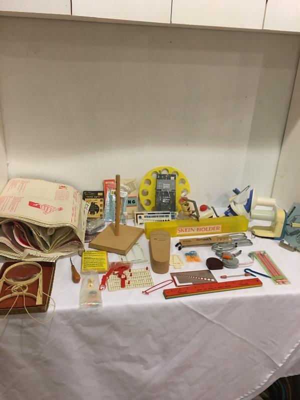 A plethora of knitting and crochet notions includes skein holder, two ball winders, hands free magnifying glass, Tailor Clapper, knit Cheka, tape measure, knitting counter, Pom Tree, patterns and much more.