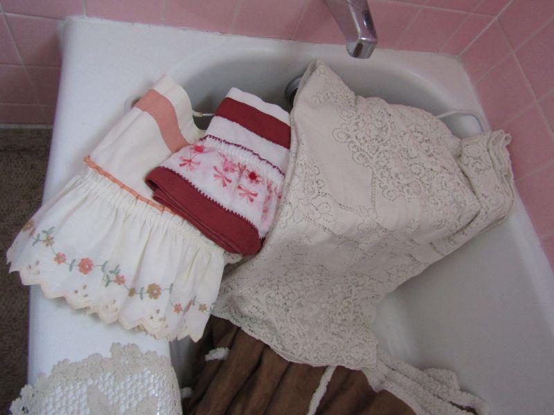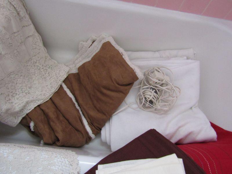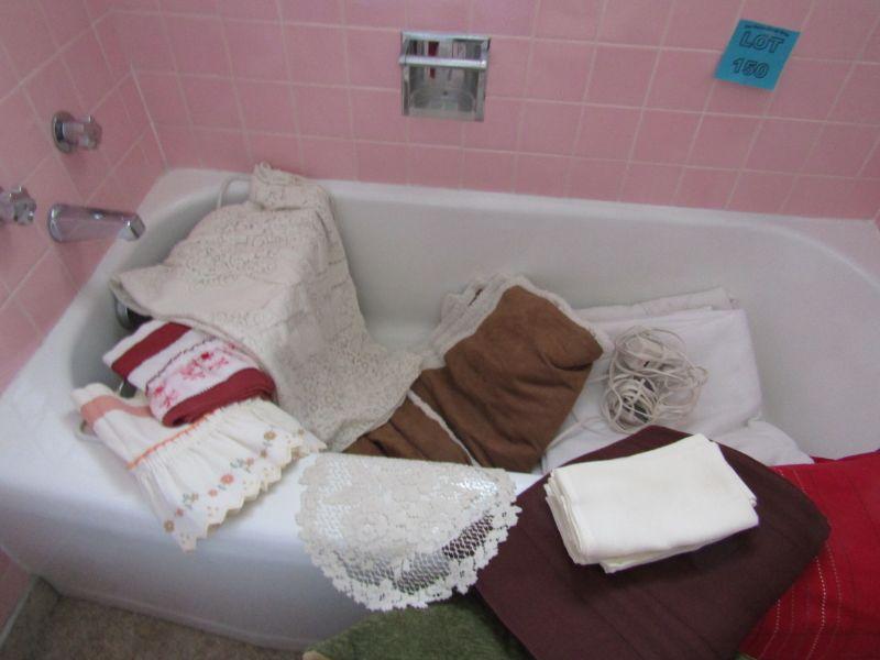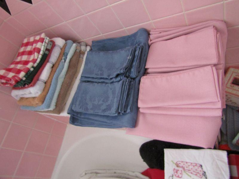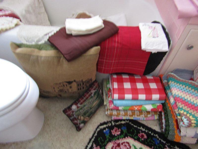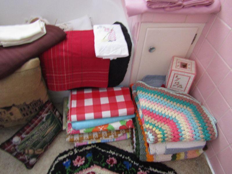 TABLE CLOTHES, CLOTH NAPKINS, HEATING BLANKET, HOOK & LATCH RUG, TOWELS AND MORE