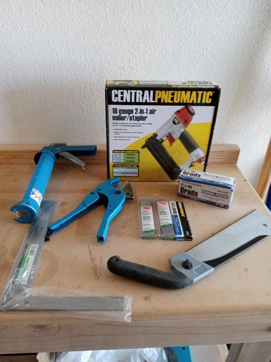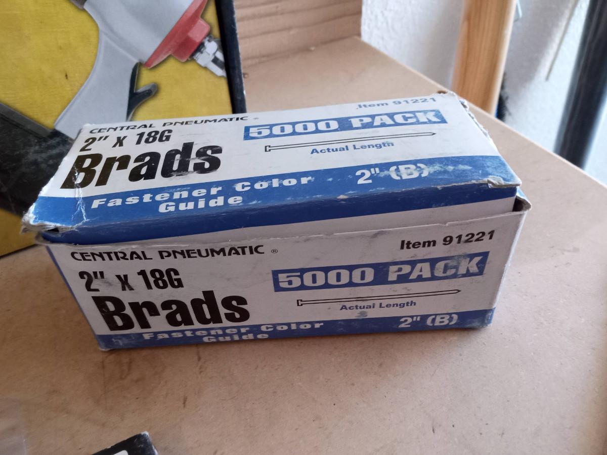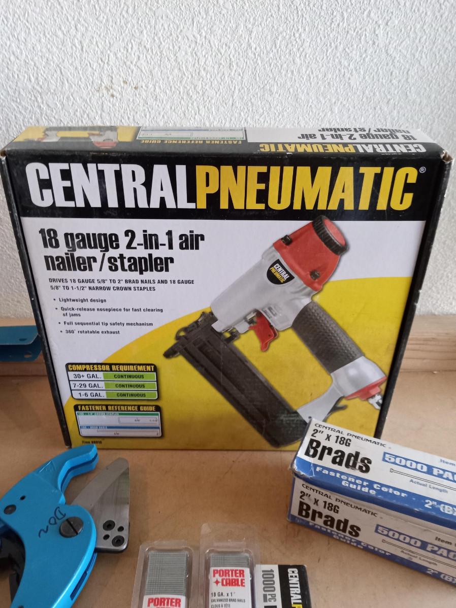 LOT 150 NEW PNEUMATIC NAILER/STAPLER, BRADS AND SOME HAND TOOLS