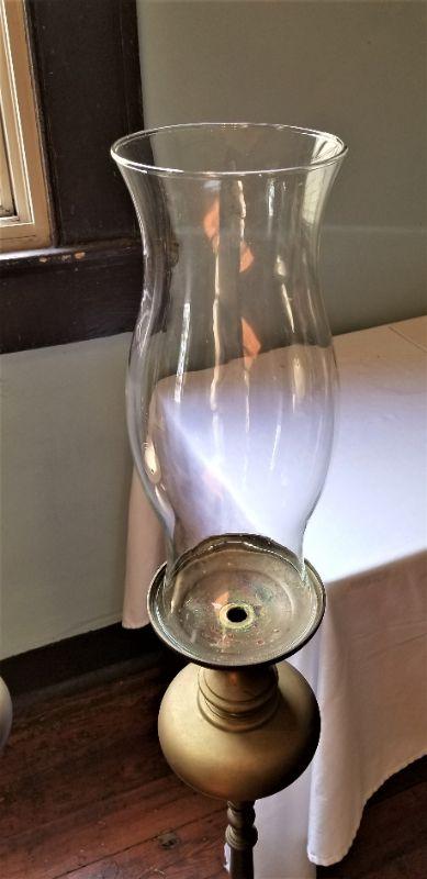 Lot #150 Pair of Tall Brass Candle Holders w/Hurricane Shades