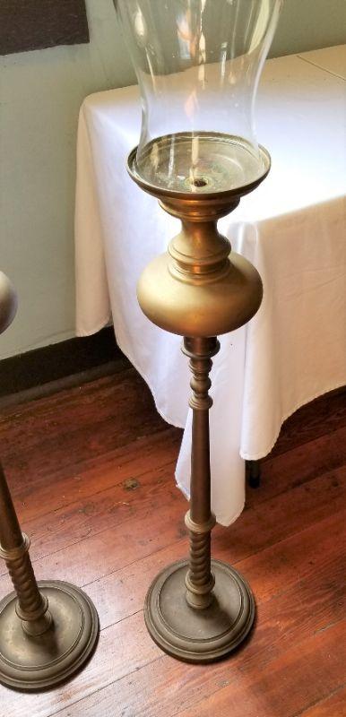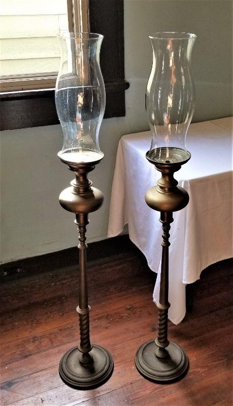 Nice pair of tall brass candle holders with glass hurricane shades. Good for indoors or patio. 50" tall w/shades - stands are 36" tall without.
