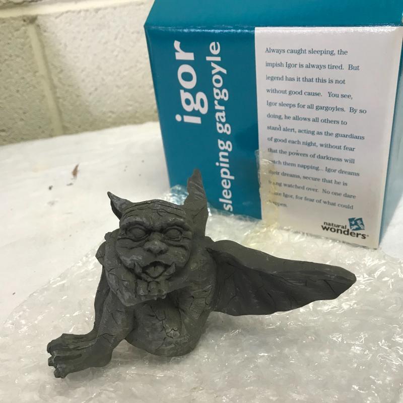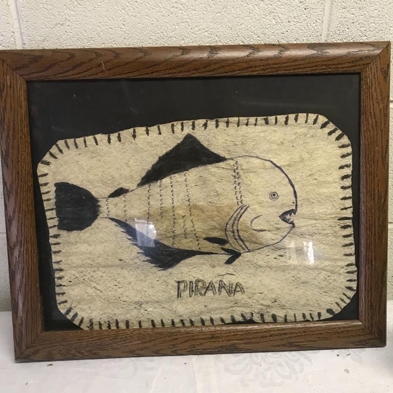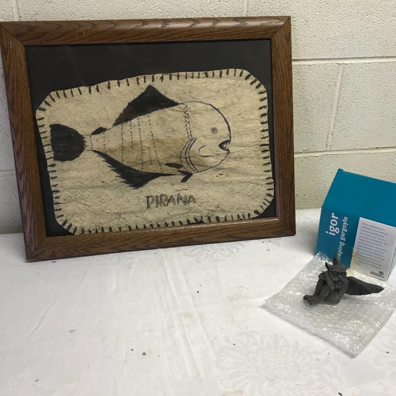 Framed Pirana art done on a woven or pressed material in pen and marker. Measures 20.5” x16.5” Lot also includes a Mini Igor Gargoyle measures 4.5” x4.5” x3” and in original box. Lot is available for shipping or local pick up in Asheville, NC.