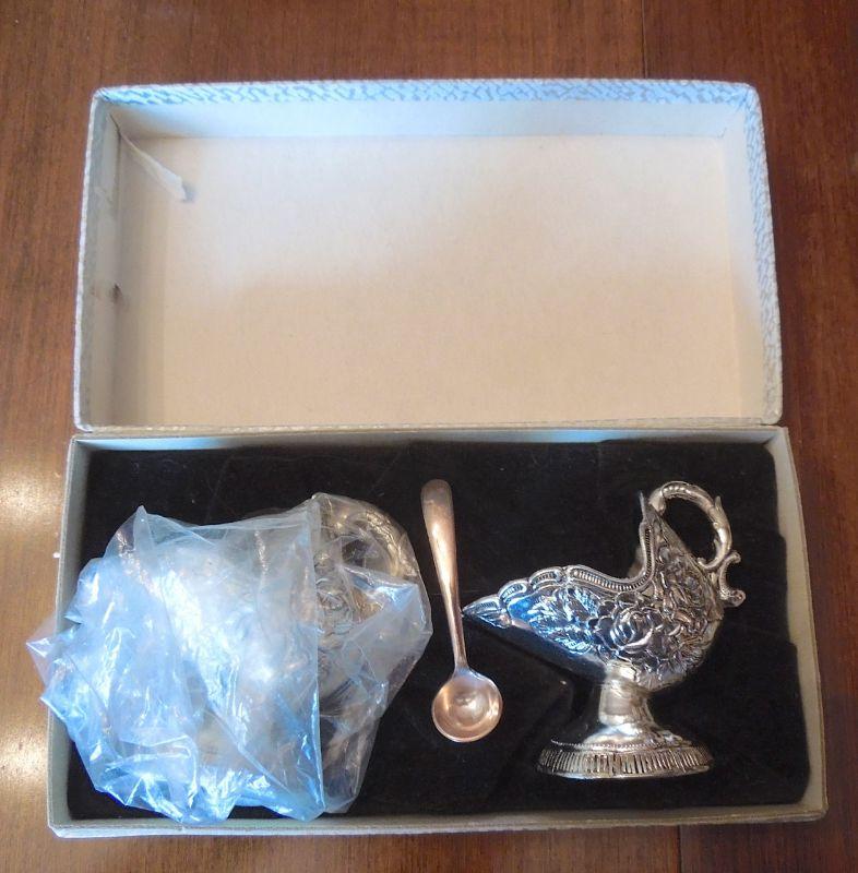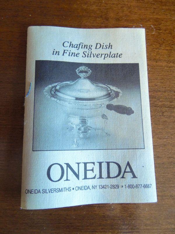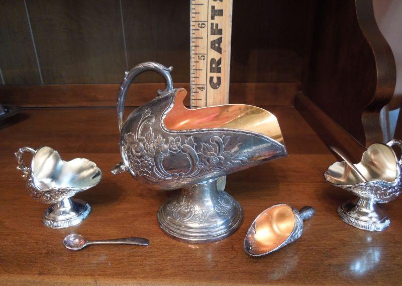 Large group o f silver plated serving pieces as seen in photo including two bowls, a pair of dented salta nd pepper shakers, a sugar scuttle scoop with spoon and two smaller scuttles with tiny spoons in a box; a pair of grape shears, a gravy boat and a complete Oneida Chaffing Dish